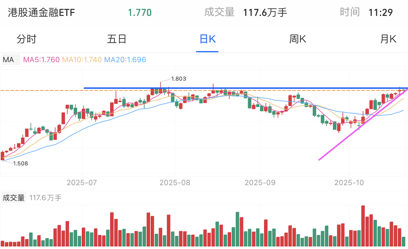 银行此前震荡下行,最近出现放量反弹,突破下跌趋势线,这几日在前高压力位下方震荡,似乎进入横盘趋势。港股金融相似,但逼近最高点压力位,这两日也有上行阻力,后市方向不明。