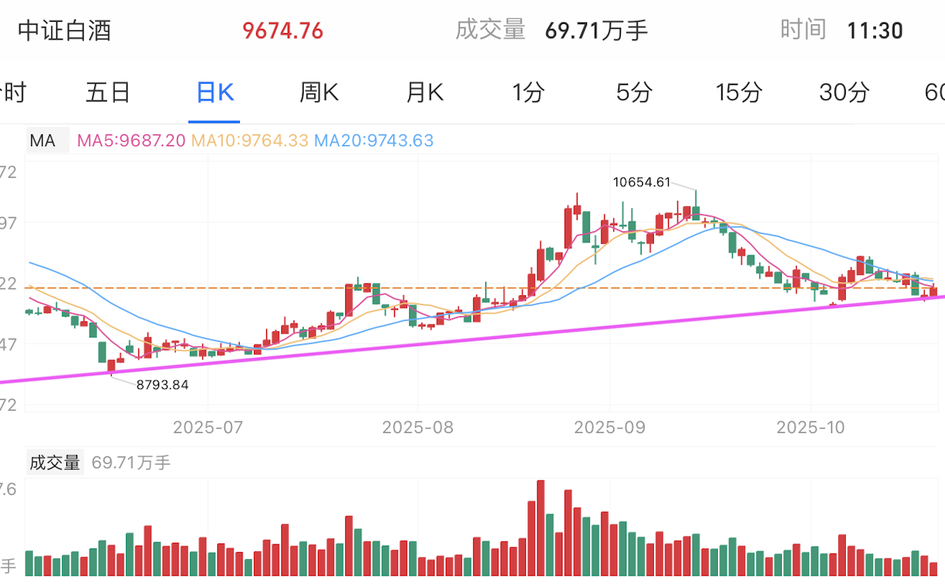 白酒此前短暂反弹,但没能持续涨势,再次回落至底部。目前已经逼近上涨趋势线,暂时守住支撑,仍为横盘震荡趋势。