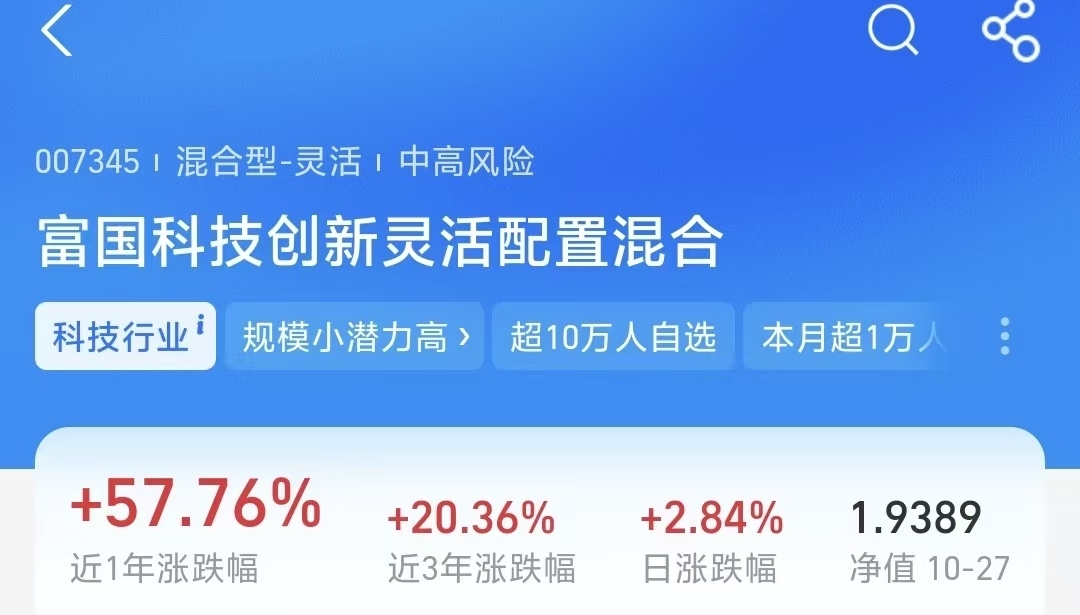 当下科技赛道正处上升周期,AI推理落地打开市场空间,算力与半导体产业链需求持续释放,成为行情核心驱动力。在此趋势下,我看好的$富国科技创新灵活配置混合$ 表现尤为亮眼,精准踩中板块节奏。