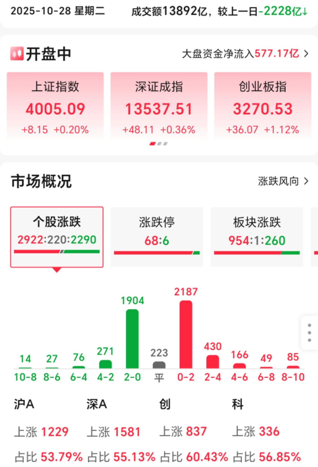 沪指在2025年10月28日隔十年站上4000点,突破4000点关口,创下逾10年新高。深证成指和创业板指也分别上涨0.52%和1.35%,市场整体呈现震荡上行的强势格局。科技相关概念成上涨主力。昨晚美股三大指数创历史新高,高通等科技股大涨带动市场情绪,叠加国内“十五五”强调了科技自立自强,但贵金属等板块表现低迷。