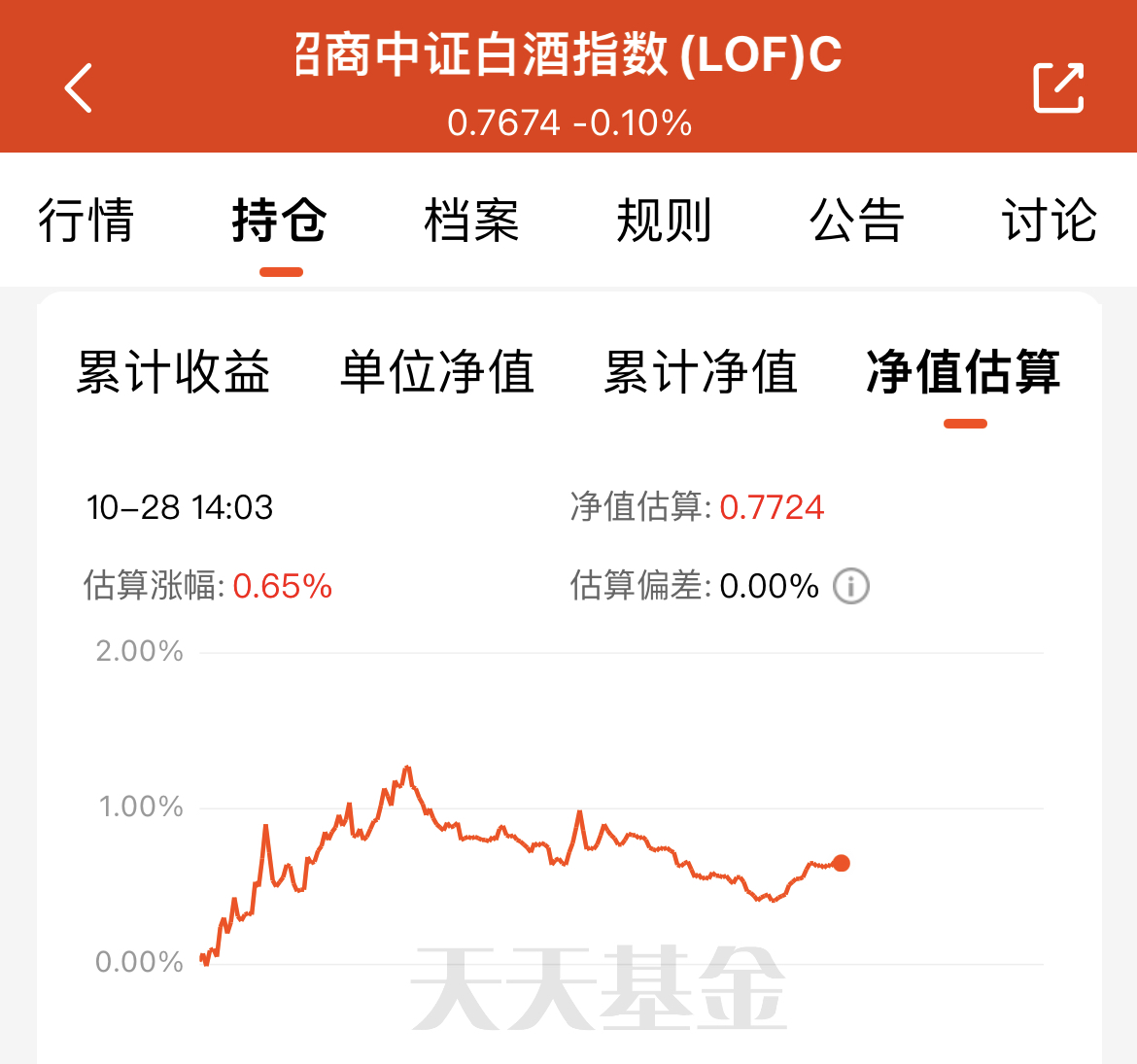 现在大盘在4000点附近有点压力,资金开始往低估值方向走,消费板块慢慢回暖,白酒也已经开始上涨,趁着刚开始反弹,今天就打算加仓$招商中证白酒指数(LOF)C(OTCFUND|012414)$了,目前它的估值还涨了0.65%,还在往上拉。