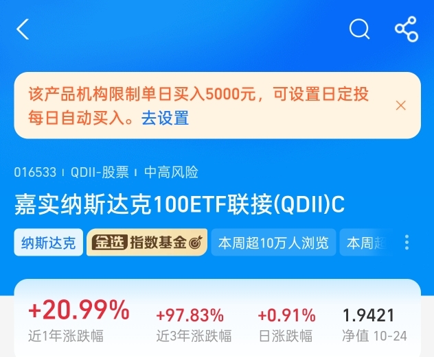 $嘉实纳斯达克100ETF联接(QDII)C$ 紧密跟踪该指数,精选了100家非金融领域的龙头企业,核心持仓涵盖苹果、微软等顶尖科技公司,投资者可借此一键布局全球优质科技标的。它昨天涨了0.91%,近一年收益达20.99%,当前估值具备一定吸引力,再结合AI、云计算等产业发展机遇,挺有前景的。现在5000的额度也是很充足哦!