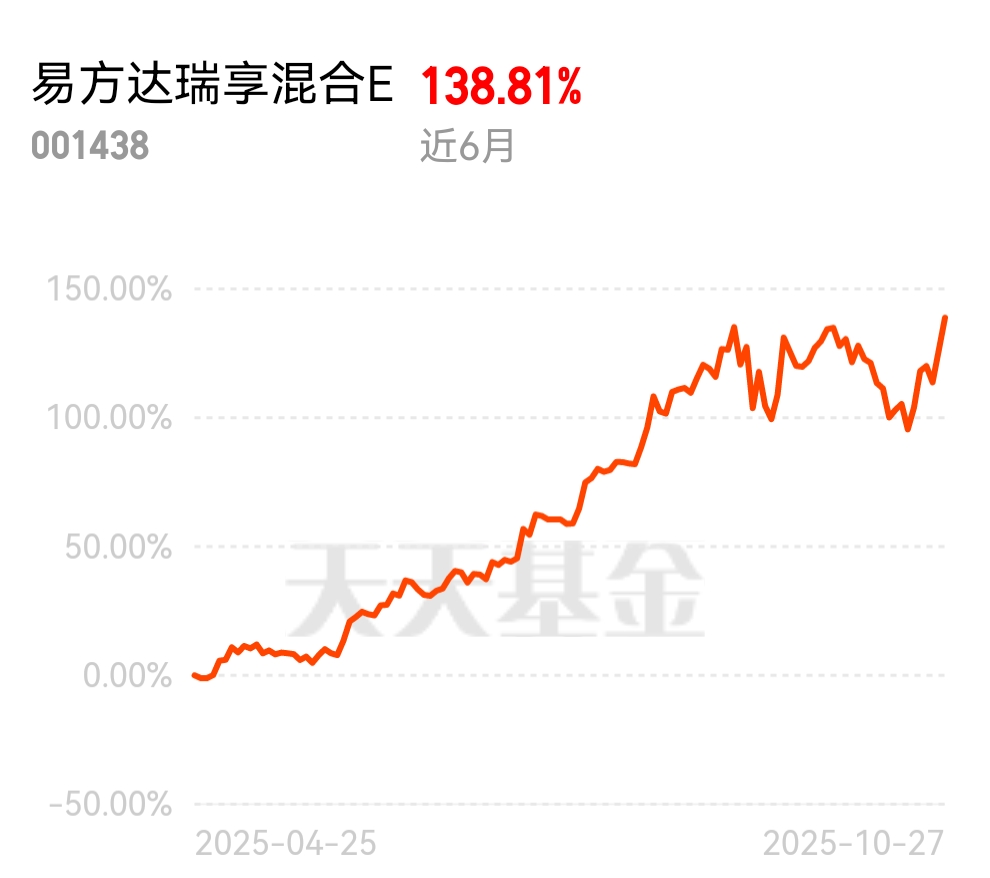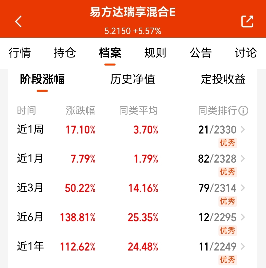 尤其是这支$易方达瑞享混合E$ ,持仓CPO板块,已经连续涨3天,近1周收益有17.10%,近半年也已经涨了138.81%了,相对大多数板块,也是有明显的超额收益了;