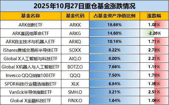 【重仓涨跌】根据基金2025年三季报披露,重仓基金中3只为“木头姐”凯茜伍德旗下聚焦于美股前沿科技的基金,合计占比达43.46%。