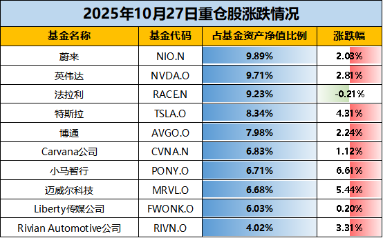 【十大持仓】根据最新披露的基金定期报告,截至2025年三季度末,华宝海外新能源汽车前十大重仓股包括蔚来、英伟达、法拉利、博通、特斯拉、Carvana公司、小马智行、迈威尔科技、Liberty传媒公司、Rivian Automotive公司,占基金资产净值比例合计为75.42%。