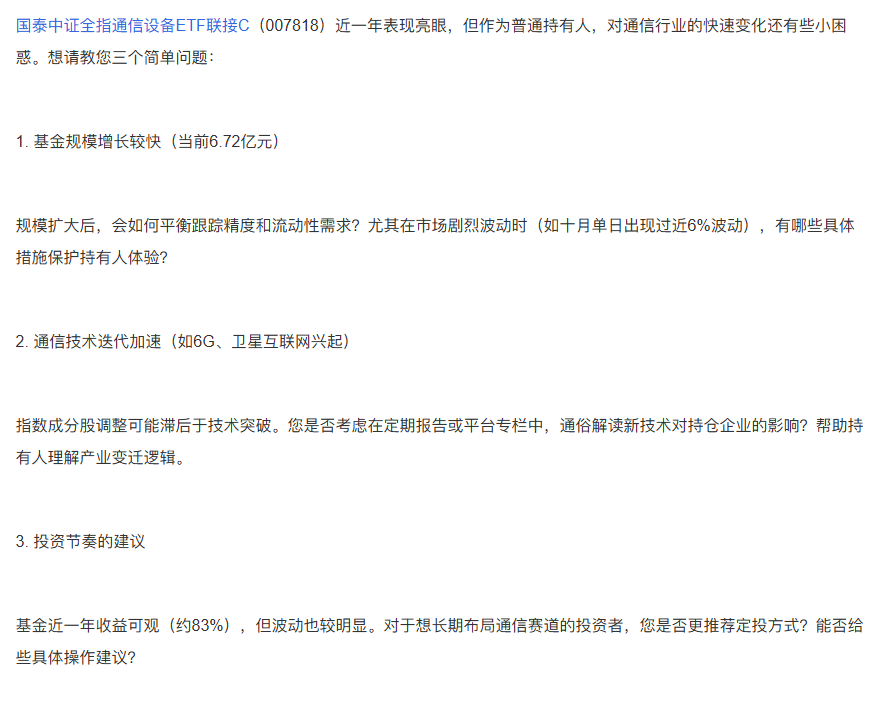 首先,$国泰中证全指通信设备ETF联接C(OTCFUND|007818)$是被动指数型基金,主要通过投资于目标ETF跟踪标的指数表现,具有与标的指数相似的风险收益特征,在管理中我们会尽力做到紧密跟踪标的。