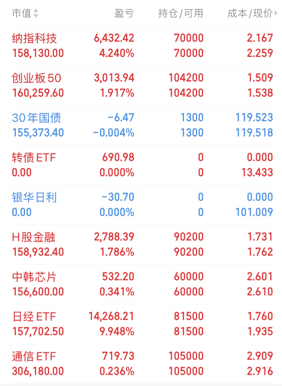 ETF收盘涨跌不一,纳指100ETF(159660)领涨3.00%,军工ETF易方达(512560)涨1.47%,国防ETF(512670)涨1.46%。黄金股票ETF基金(159322)领跌3.74%,黄金股ETF(517520)跌3.69%,黄金基金ETF(159812)跌3.66%。