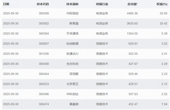 正巧,宝儿姐家有一只聚焦于AI产业链的基金,那就是$华宝创业板人工智能ETF发起式联接C(OTCFUND|023408)$。截至2025.9.30,标的指数前十大权重股见下: