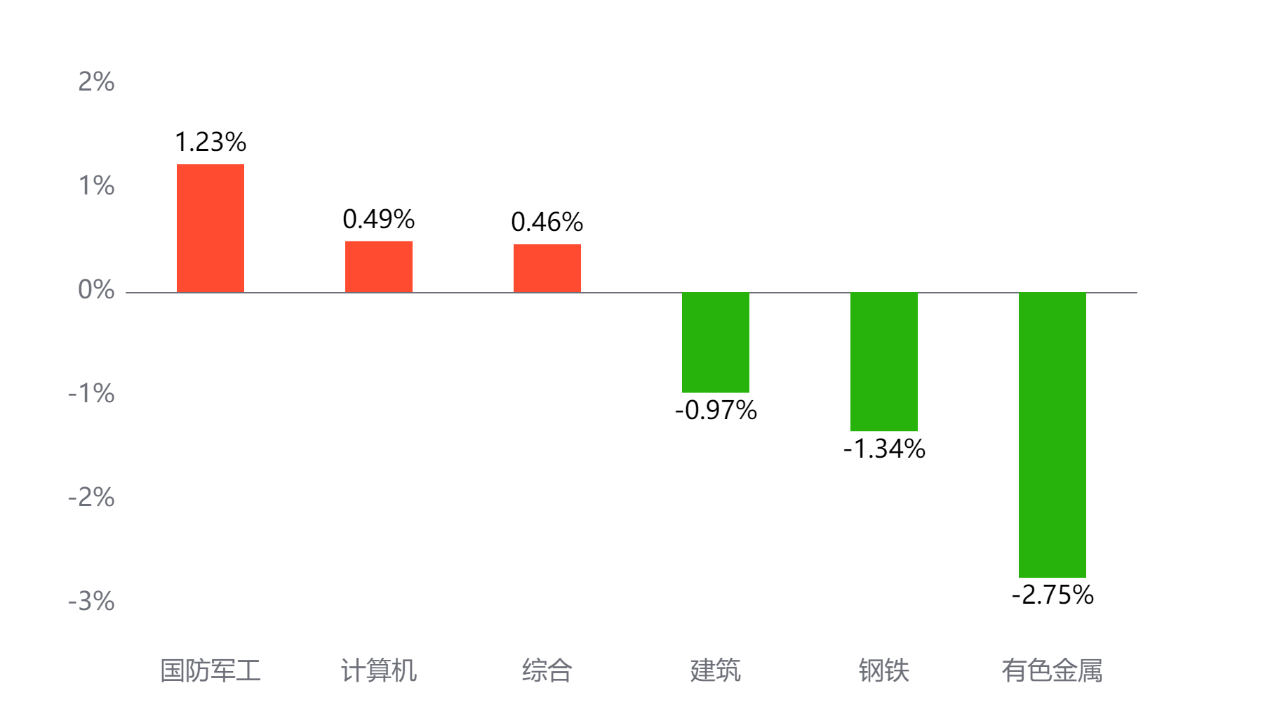今天表现最好的行业板块依次为国防军工、计算机、综合,表现最差的依次为建筑、钢铁、有色金属。