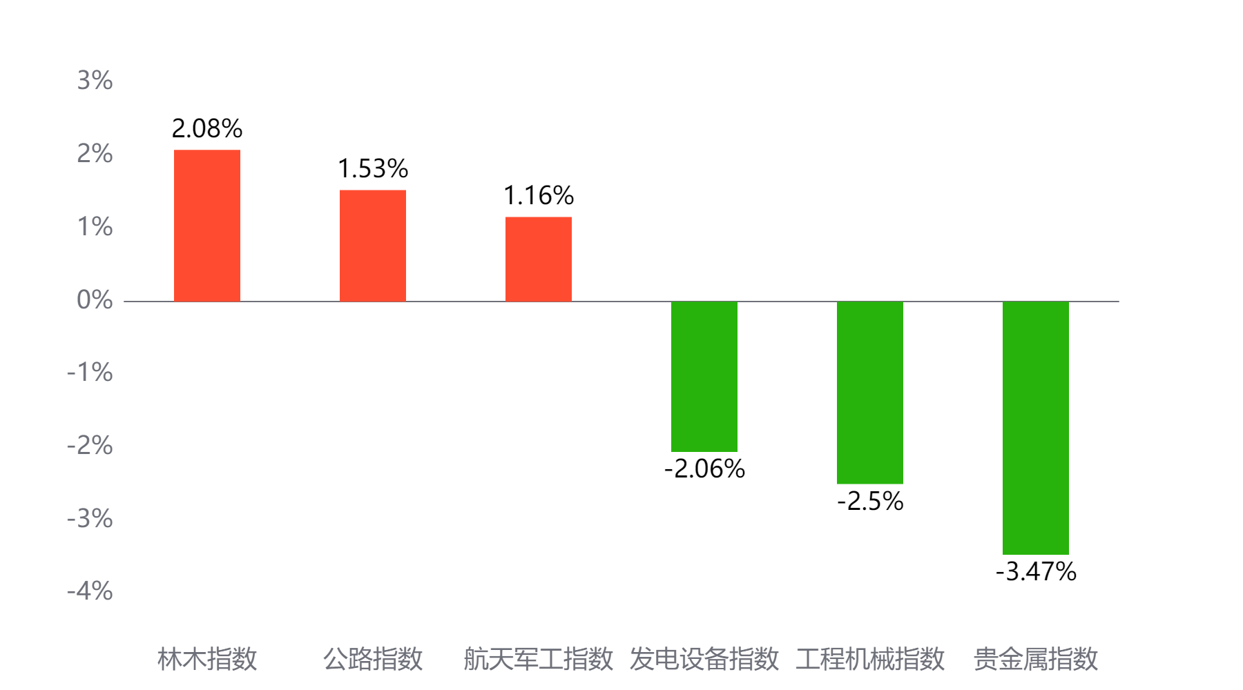 今天表现最好的主题概念依次为林木、公路、航天军工,表现最差的依次为发电设备、工程机械、贵金属。