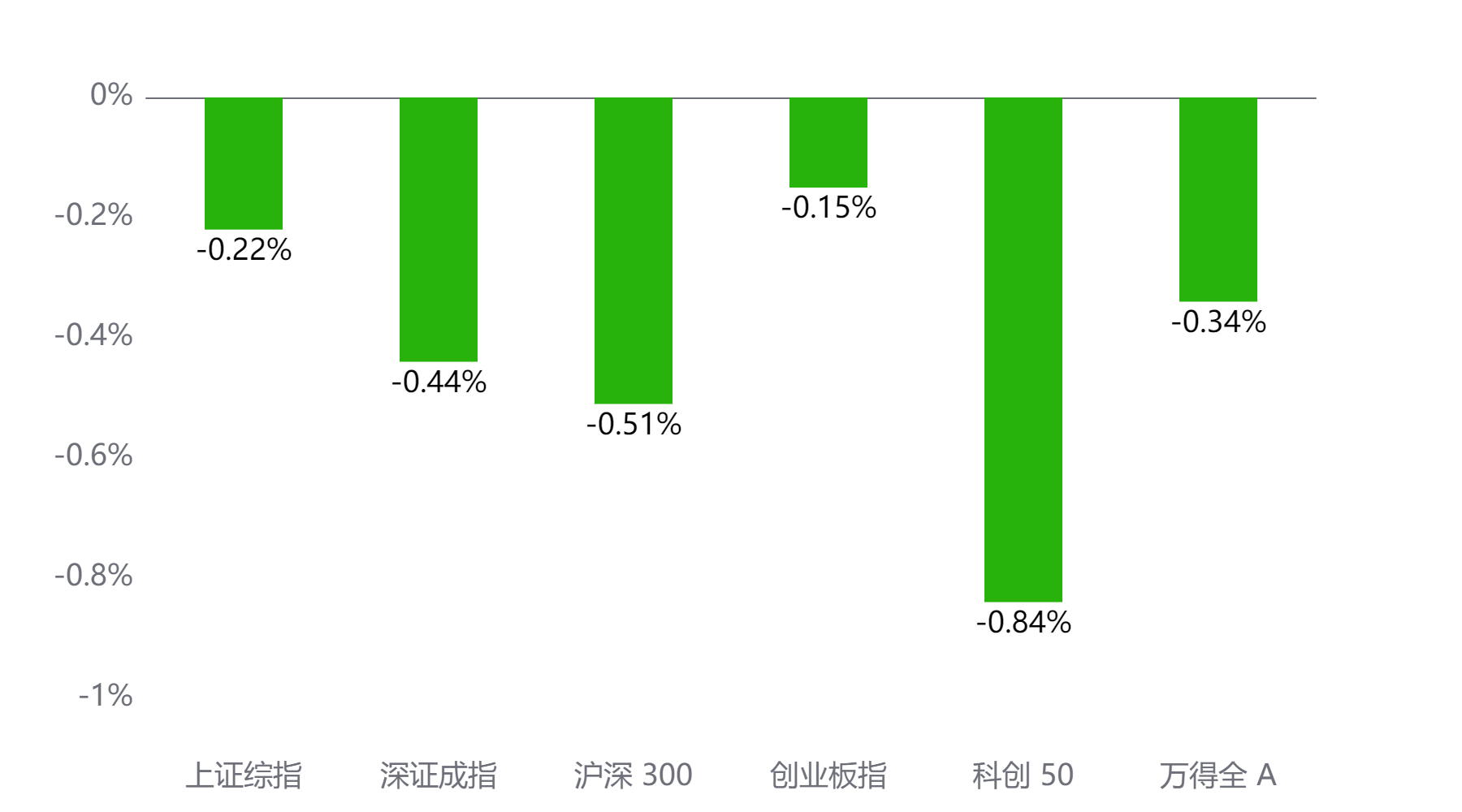截至今日收盘,市场各主要指数普遍下跌。上证综指收3988.22点,下跌0.22%;深证成指收13430.1点,下跌0.44%;沪深300下跌0.51%,创业板指下跌0.15%,科创50下跌0.84%,万得全A下跌0.34%。