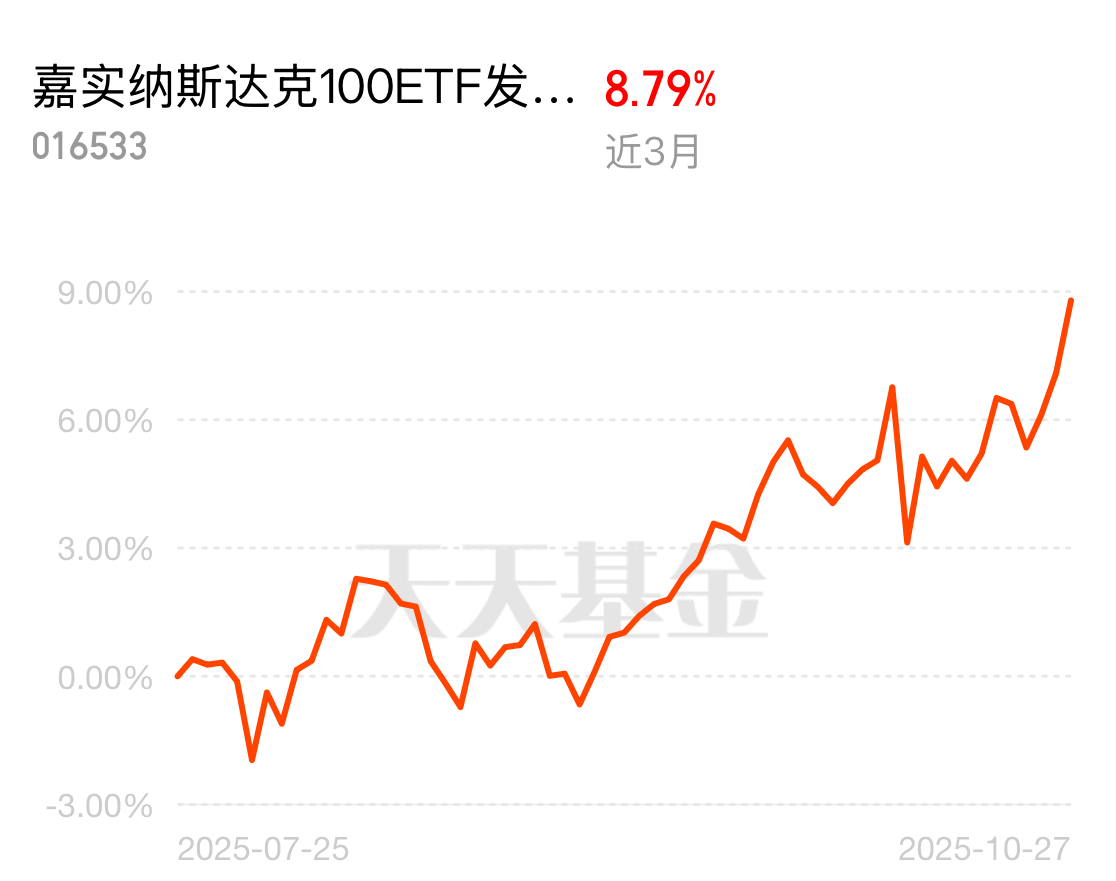 策略分享型聊个实在的,现在做资产配置就得 “东边不亮西边亮”。A 股最近不给力,正好把一部分仓位调到美股。中美谈判缓和降低了外部风险,美联储议息会议的降息预期又给市场添了动力,再叠加财报季的业绩支撑,美股的性价比一下子就上来了。我研究一圈入手了嘉实纳斯达克 100(016533),它额度最高,跟踪的指数成分股都是硬通货,长期跟着趋势走,心里踏实。$嘉实纳斯达克100ETF发起联接(QDII)C人民币$