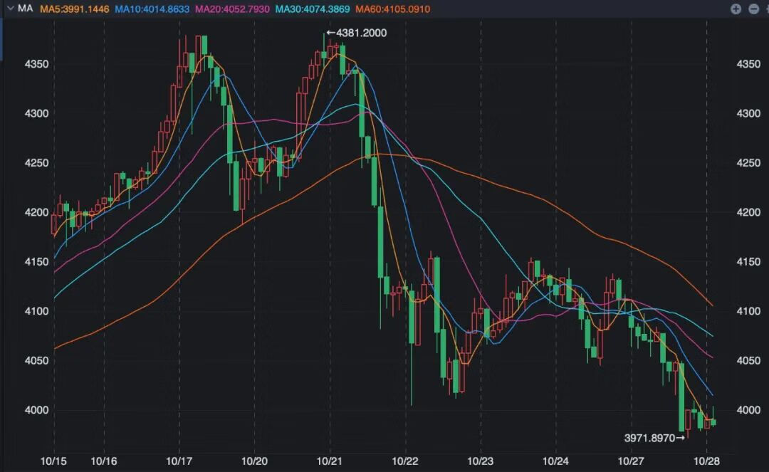风险缓释的另一面,当然就是避险资产的下跌,昨晚,现货黄金持续暴跌,单日最终大跌超3%,下图,是现货黄金从10月15日以来的走势图,可以看到,其从历史最高位,4380美刀左右,到昨晚跌破4000美刀,高位下跌超400美刀,跌幅超9%。