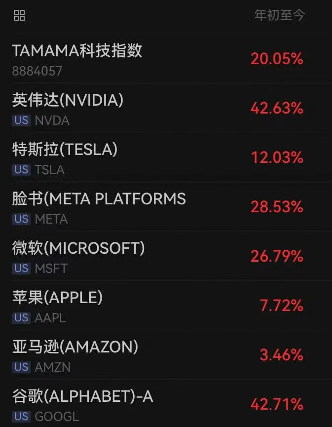 这也刺激美股的科技股大爆发,昨晚,代表七巨头的TAMAMA指数,大涨2.4%,年内收益,首次超过20%。