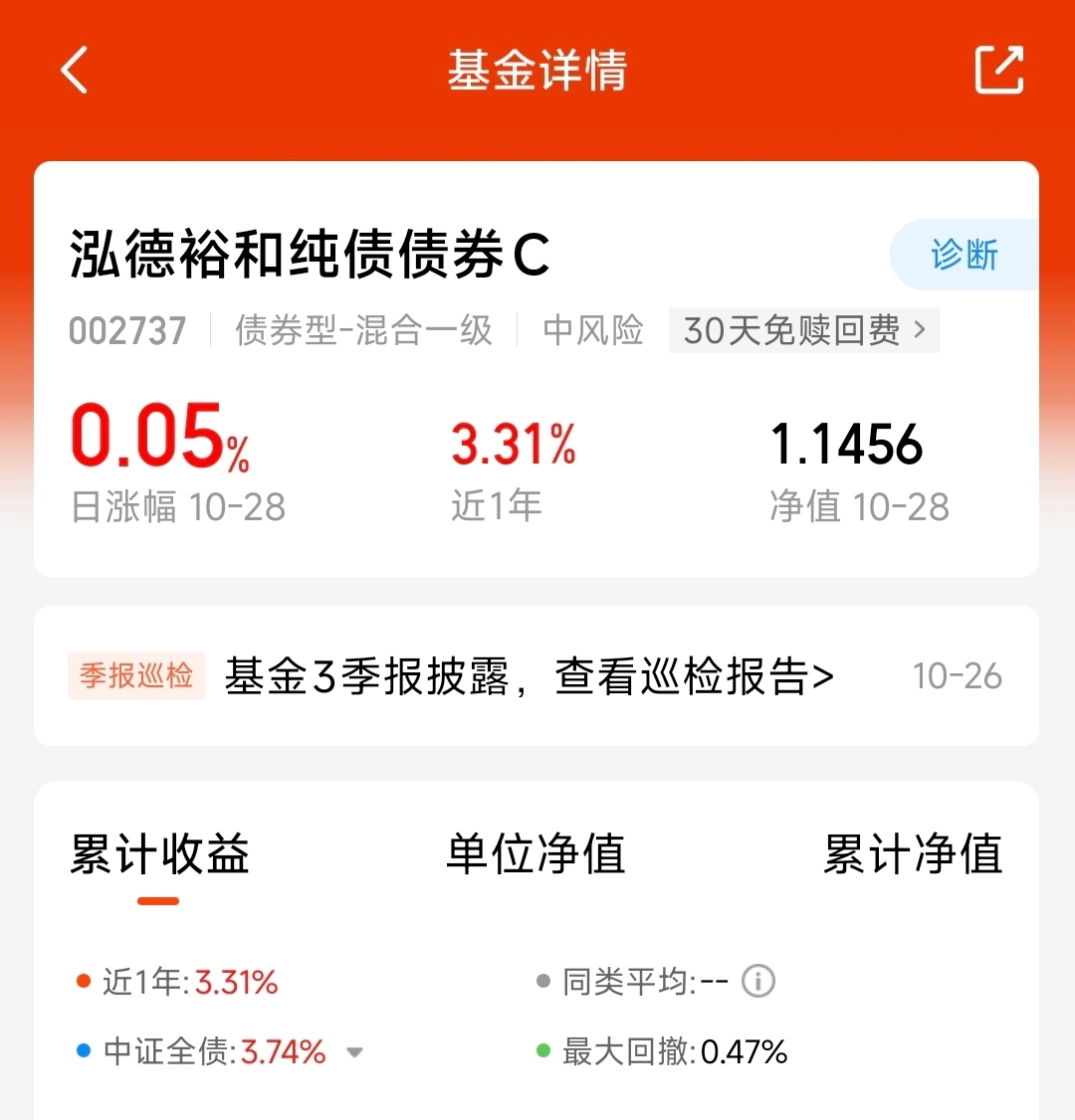 选来选去还是觉得裕和纯债债券会更有保障一些,进入10月份以来都没碎蛋过,且今天又