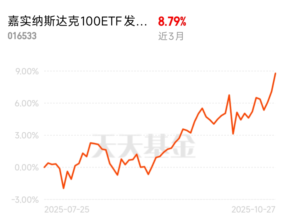#A股盘中突破4000点!下个目标位在哪?# 今天大A行情出现了板块分化,不过今晚纳指表现倒是很稳哦,好在一直有在定投$嘉实纳斯达克100ETF发起联接(QDII)C人民币$ ,话说他家的额度还挺不错的,单日有 5000 额度呢,在市场上虽然不是最高,但也相当可观啦。而且表现也挺不错的,昨天涨幅 1.6%,最近美联储议息决议牵动着投资者的心,美股财报季也让市场充满了活力。而中美谈判预期不错,短期市场风险降低,对股市是个利好消息,我觉得可以多关注起来