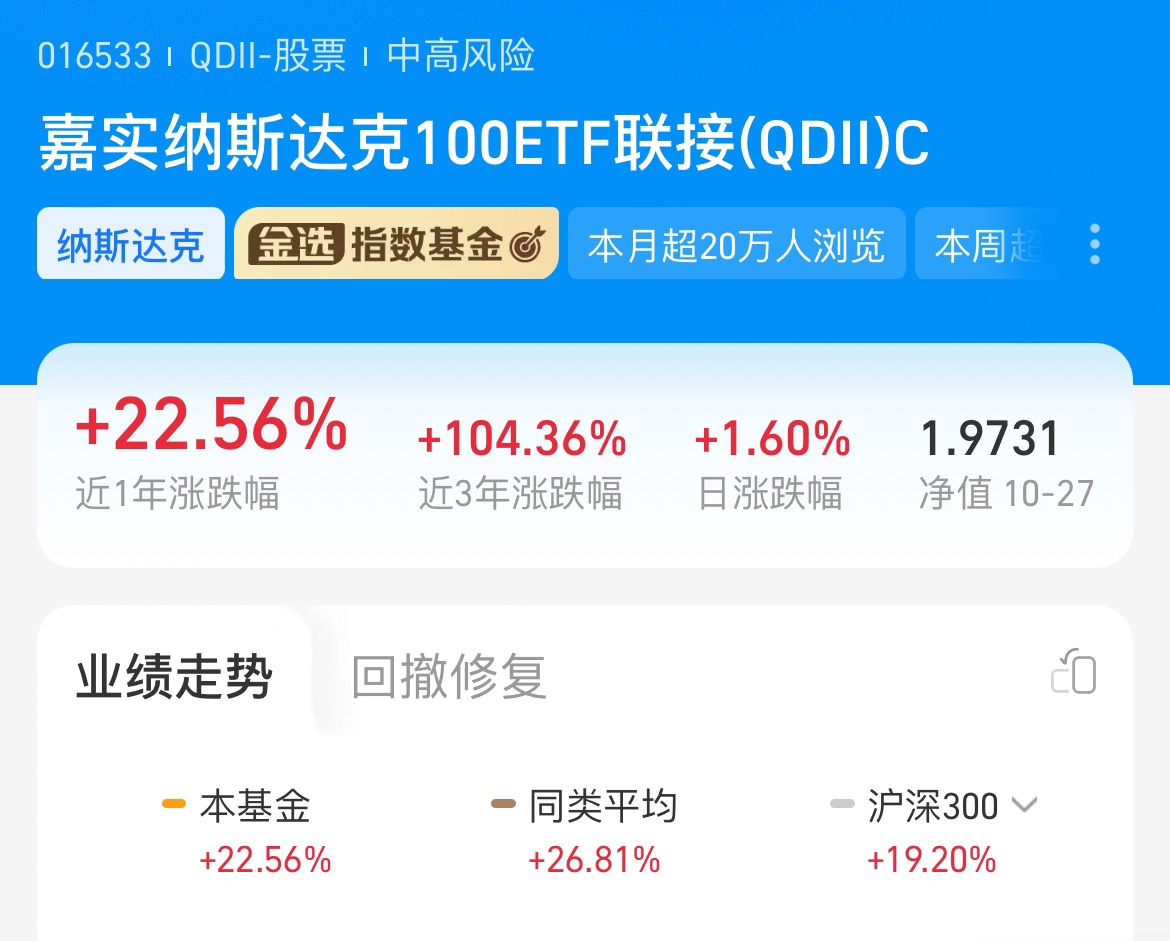 最近关注的$嘉实纳斯达克100ETF发起联接(QDII)C人民币$ 表现格外亮眼,今天单日就收获1.60%的涨幅,短期势头很稳。把时间线拉长看更惊喜,近一个月稳步上涨4.10%,近六个月更是强势攀升27.72%,长期业绩更让人安心,近三年收益率直接突破100%,达到104.36%,这样的成绩着实让人满意。看着它一步步交出漂亮答卷,已经开始期待接下来能延续这份好势头,继续带来稳健回报了。