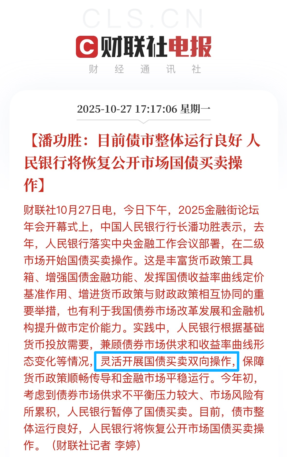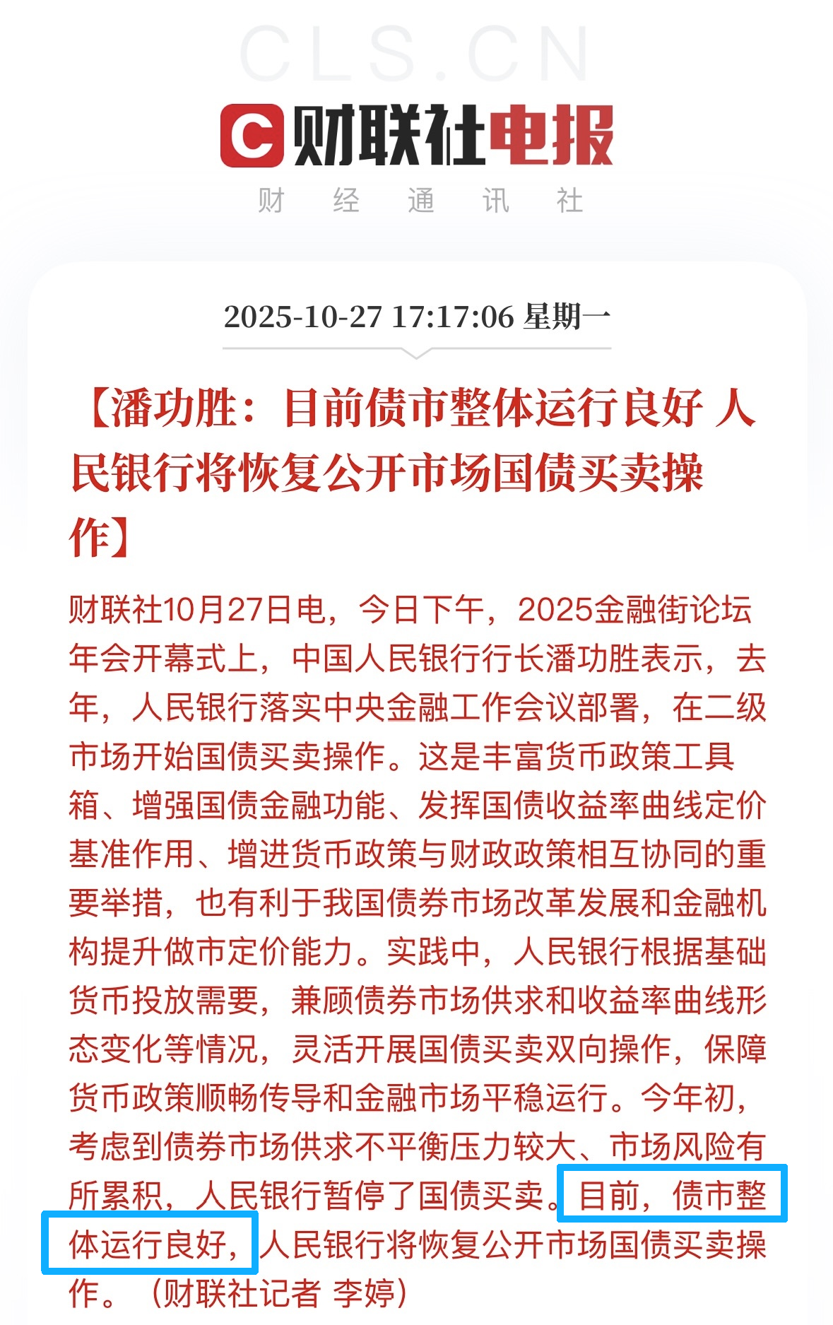 昨天行长在2025年金融街论坛年会发表公开讲话,最重磅的就是说到了市场期待已久的恢复国债买卖操作,这个消息在5点后发布,10年期国债收益率应声大幅下行近5个bp,债券价格上涨,这部分收益会体现在今天。