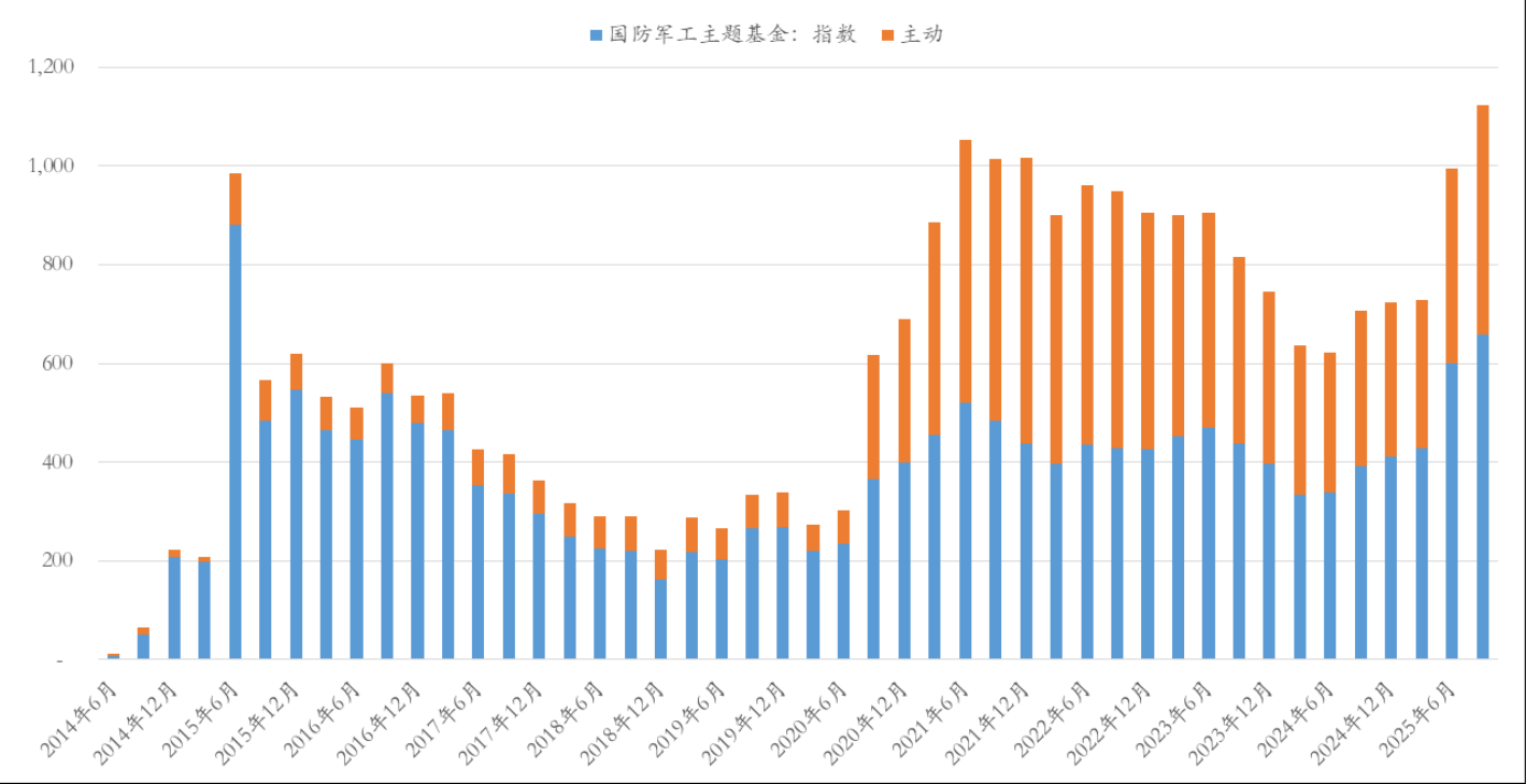 8、最后,再说下公募三季报的情况。首先,根据上图,国防军工三季报是被机构减仓的,这个也不能算是坏事,至少持仓拥挤度是不高的。其次,看国防军工行业主题基金规模,三季度再次突破1,000亿,创了历史新高。也就是说负债端是加仓的,但是投资端是减仓的,有点背离…