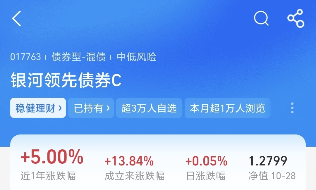 昨天股市震荡,债市挺不错,利率债和信用债纷纷上扬,晚上都有不错的收获。混债相对就表现一般了,不过我的$银河领先债券C$ 却逆势收蛋5个,挺不错的,长期来看近一年有5%,也不错。当下大A行情不错,我觉得还是这种固收加更为稳当,今天我再来点。