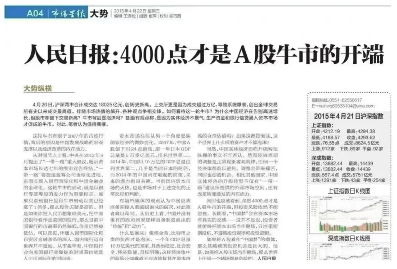 十年前的2015年4月,人民日报曾发文说,4000点才是A股牛市的开端。