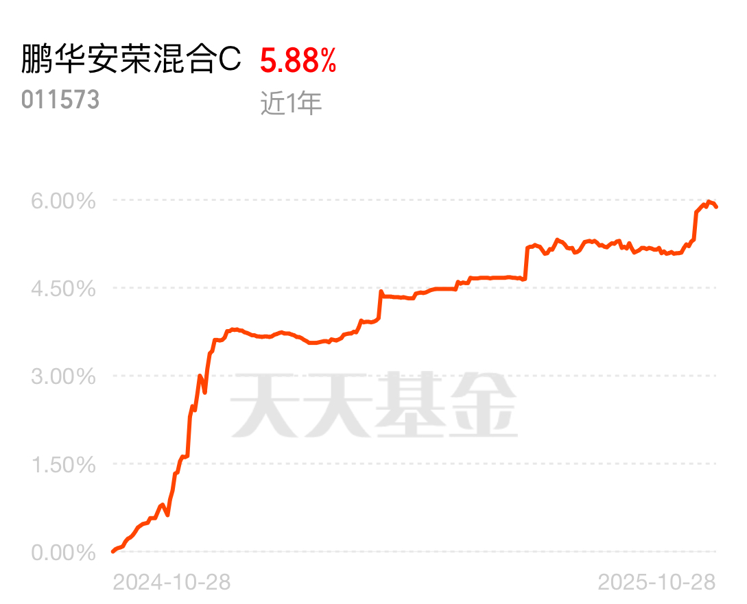前几天我把波动大的债基清仓了,我已经配置了足够多的科技股票基金了,债基就图个“稳健”,不追求“刺激”了,想买个“余额宝plus”性质的债基,今天我来建仓$鹏华安荣混合C$ ,收益曲线非常稳,一条小小的倾斜向上的直线,几乎看不到调整的小缺口,近一年收益率5.88%的涨幅也完全符合我“稳中求进”回报预期。波动小、收益稳,这不就是我们买债基的最终目的么?