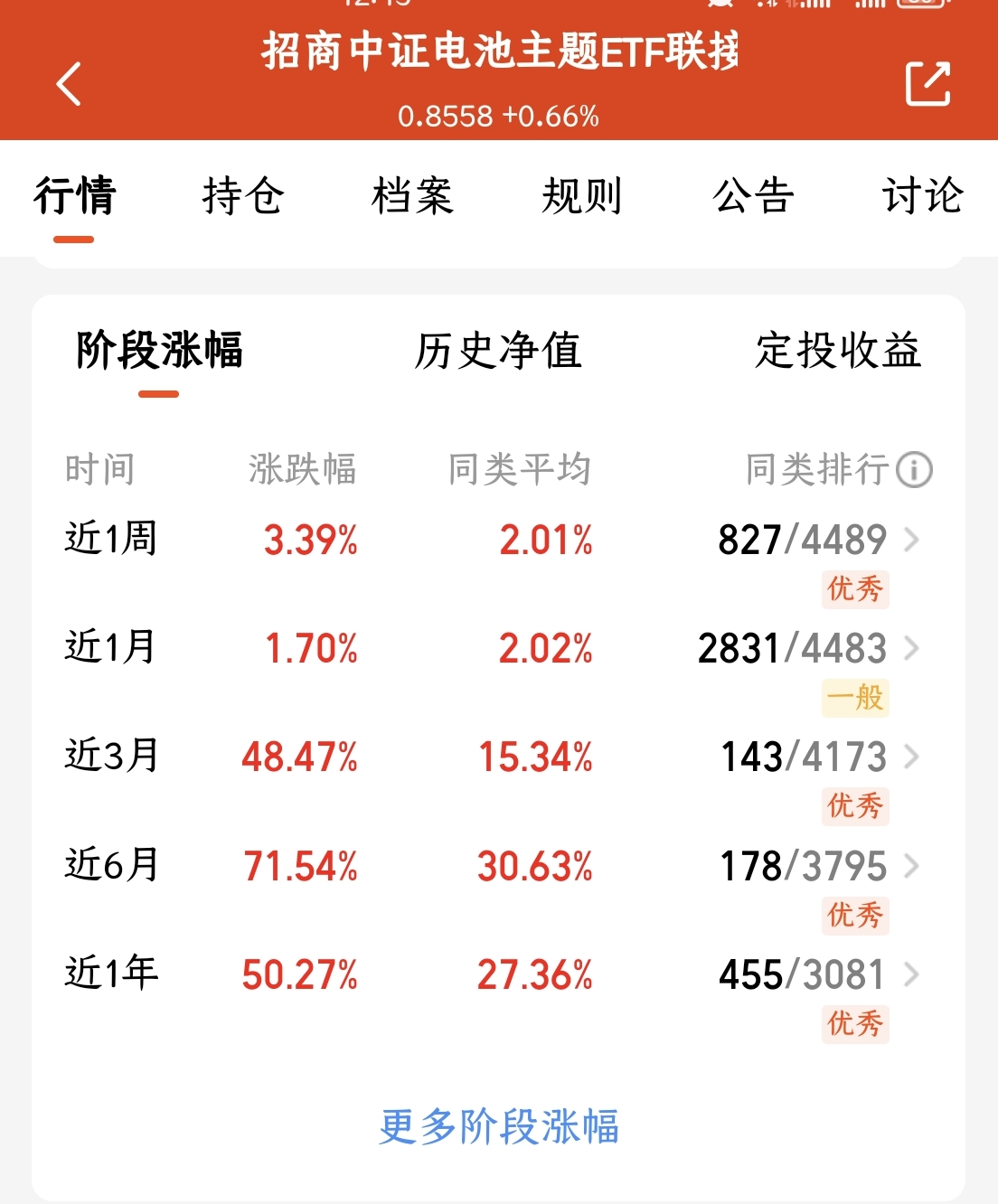 今日股市表现起伏,但电池板块持续坚挺。$招商中证电池主题ETF联接C(OTCFUND|016020)$基金昨日上涨0.66%,近半年涨幅达71.54%,表现亮眼。当前正处于三季度财报披露窗口期,多家电池企业业绩优异。宁德时代前三季度营收同比增长9.28%,亿纬锂能、国轩高科、厦钨新能等公司均实现两位数增长。储能需求保持强劲,固态电池技术加速推进,行业中长期逻辑稳固。近期市场虽有波动,电池板块韧性十足,继续加仓啦!