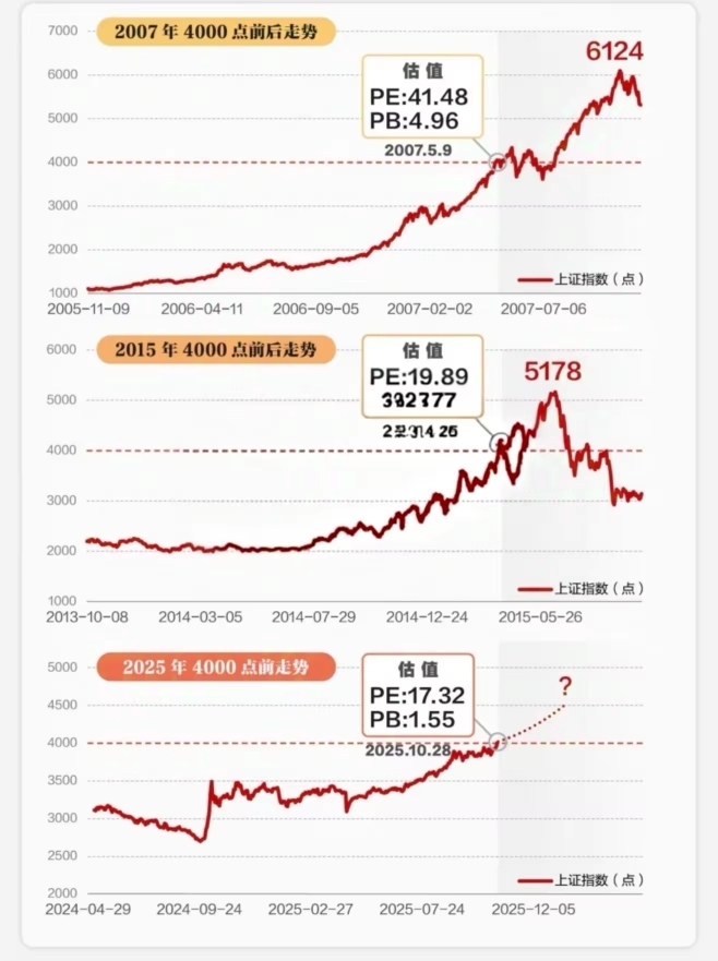 好多朋友首次见证上证指数到4000点,不少人觉得这是终点。但回顾A股历史,沪指曾两次有效突破4000点。2007年5月9日首次站上后,不到半年最高涨至6124点,涨幅53%,不过中间最大回撤11.82%;2015年4月8日再次突破,2个多月涨至5178点,涨幅近30%,最大回撤7.10%。
