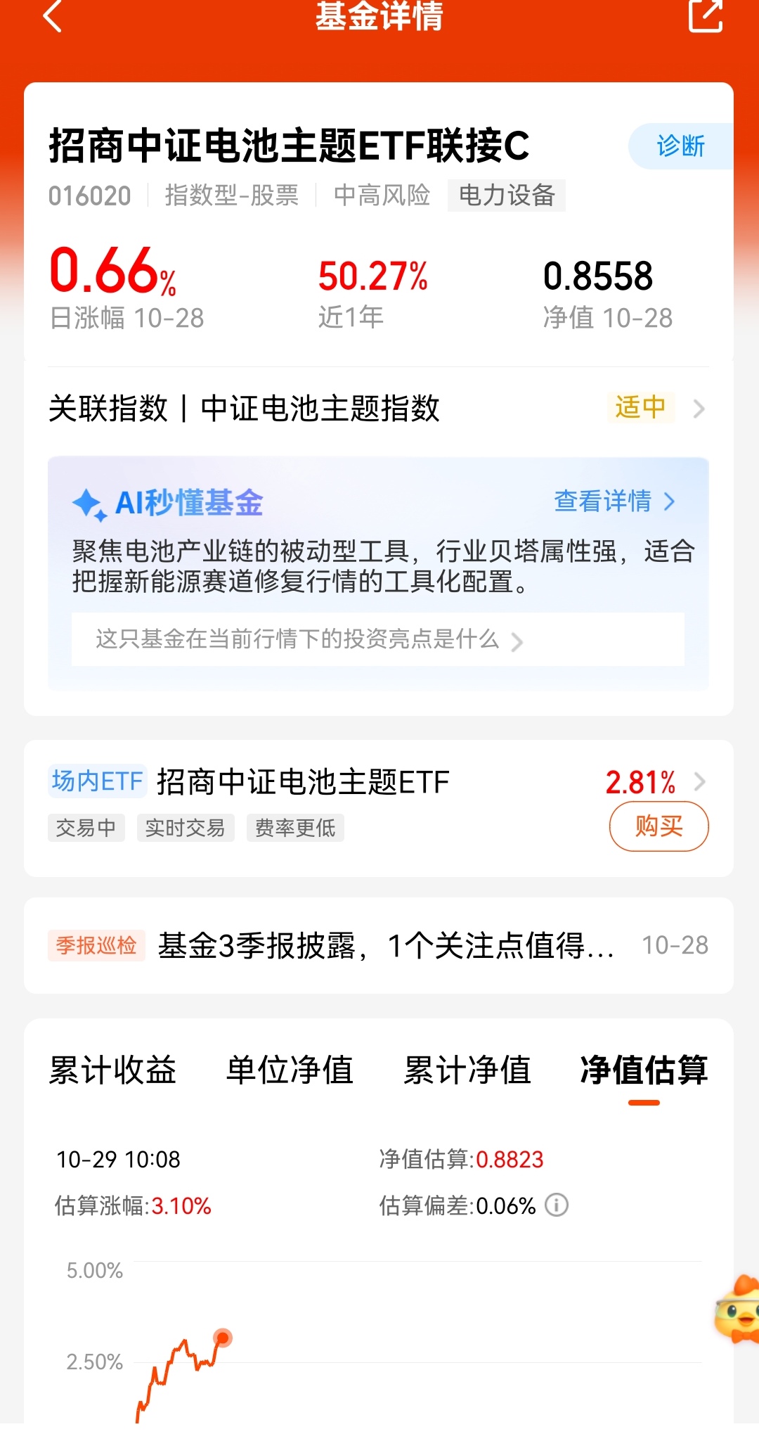 今日A股市场迎来反弹回暖,电池赛道涨幅强劲,而近期海外储能市场的需求越发高涨,这也为电池板块带来强势上涨动力,同时我留意到$招商中证电池主题ETF联接C(OTCFUND|016020)$走势持续坚挺,目前估值涨幅超3%,近半年涨幅高达71.54%,可见业绩实力优秀所在,并且在营收方面前三季度的宁德时代同比增长9.28%,众多电池板块均实现两位数的增长,可见当下储能需求持续攀升,我也决定果断定投起来,期待电池赛道后续发挥!