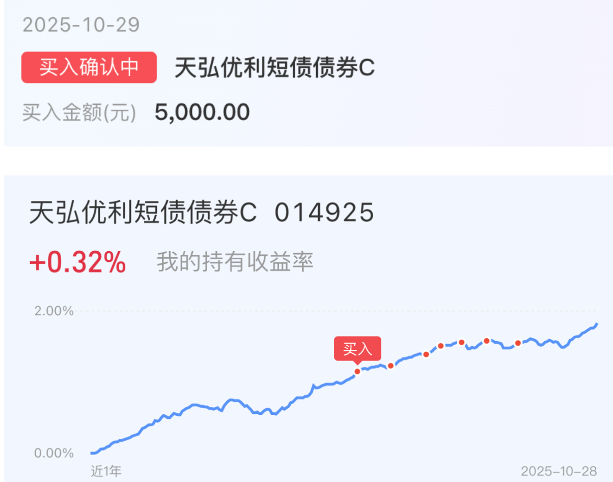 $天弘优利短债债券C$+5000,最近大盘相对来说震荡,板块轮动又快,我今天就不去那边博收益了,最近债券市场不错,人民银行明确将恢复公开市场国债买卖操作,受此重磅信号推动,债市开始反弹,所以我今天继续加一些债券,天弘优利这只基金是短债,其中信用债持仓117.62%,利率债5.44%,整体波动小,我已经拿了快半年了,近一年最大的回撤只有0.19%,13天就修复完成了,非常稳的一只基金,当底仓配置了,我今天继续加仓一些。