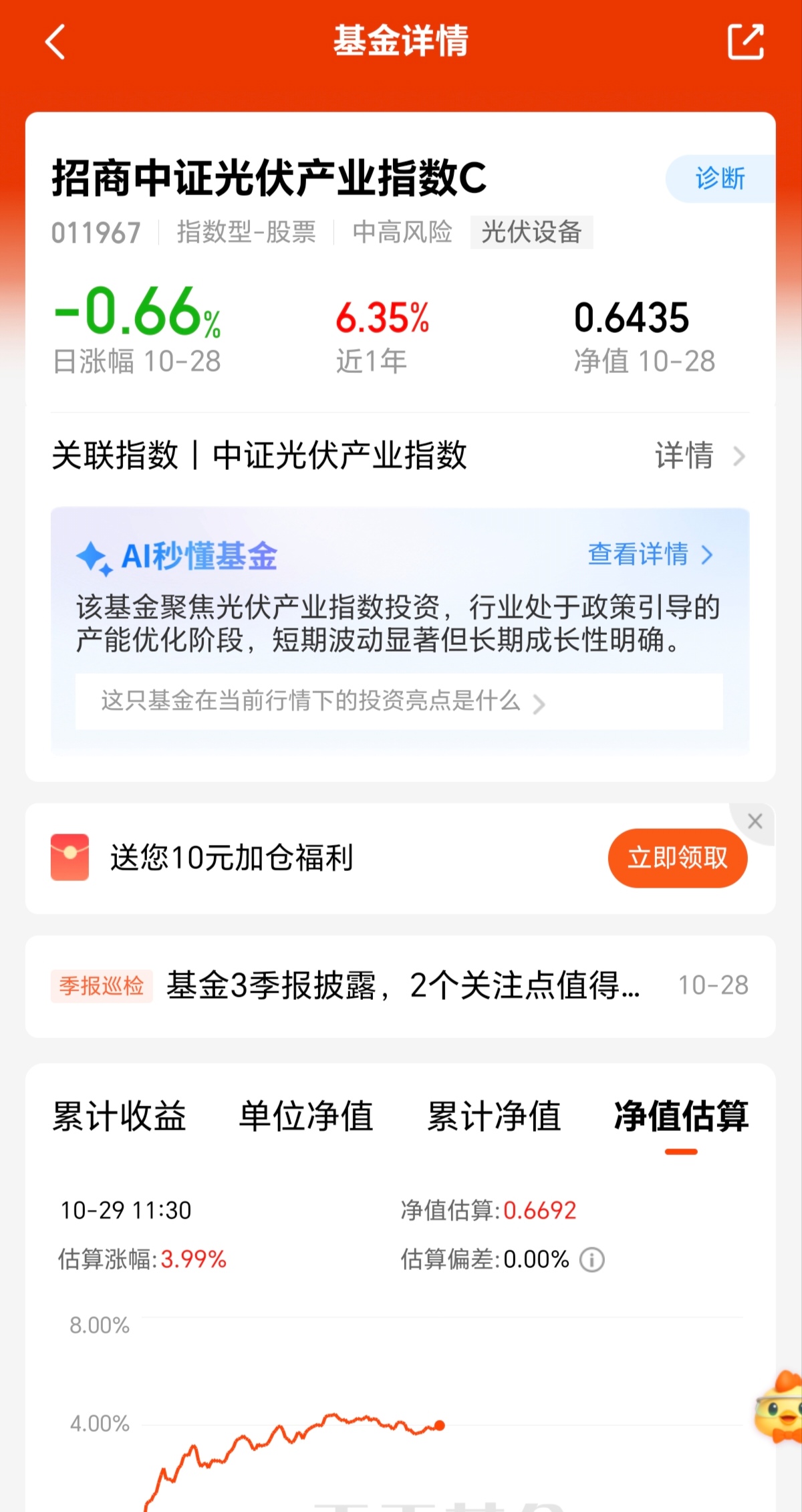 今日光伏板块带来强势上涨动力,而此轮光伏的核心特征是“确定的修复”与“预期的改善”并存,同时随着海外新兴市场的订单逐渐增速,我觉得光伏后期前景还非常值得可观, 所以我选择入手一波$招商中证光伏产业指数C(OTCFUND|011967)$聚焦光伏产业核心赛道,目前实时估值大涨3.99%,近三个月涨幅超25.66%,远远跑赢同类平均,业绩表现出色亮眼,我也将长期看好这一赛道了!