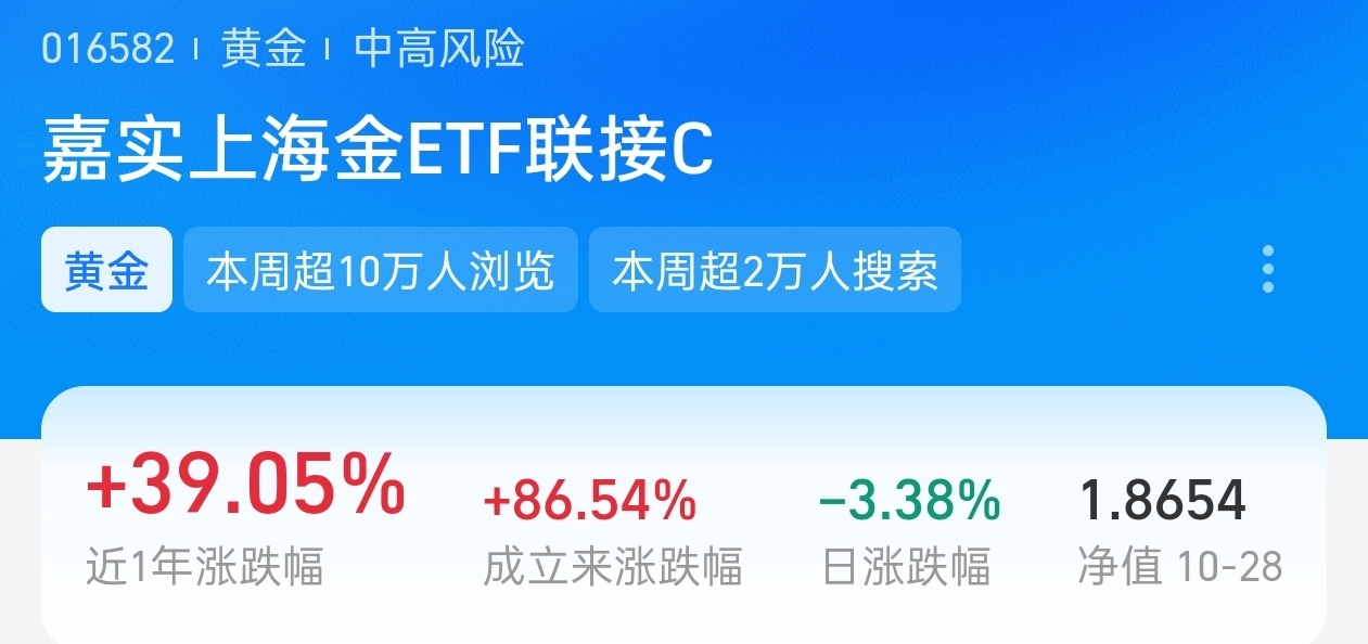 我选择$嘉实上海金ETF联接C$ 进行定投,这只基金紧密跟踪上海金定价合约,能让我便捷参与黄金市场,同时借助黄金的抗通胀和避险属性,为资产配置添一份稳健。