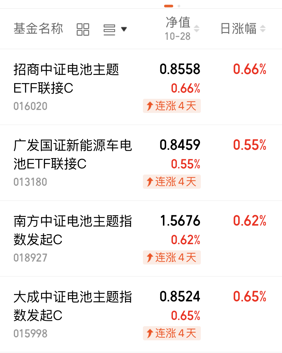 $招商中证电池主题ETF联接C(OTCFUND|016020)$昨天上涨0.66%,已经连续四天上涨,今天又大涨超5个点,真是太牛啦!