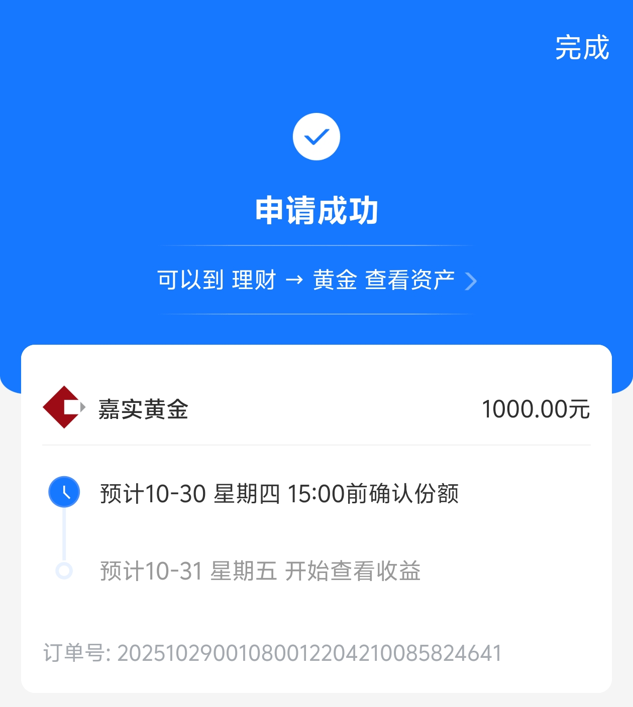 午后看到金价小幅回调,便补了1000元仓位。$嘉实上海金ETF发起联接C$ 的七天免赎政策确实实惠,尤其像今天这样遇到波动时更能体现优势。它与国内金价实时同步,省去了研究国际汇率的麻烦。在资产组合中保持适量黄金,确实能感受到分散风险的作用。使用熟悉的投资应用就能完成交易,整个过程很顺畅。低费率让我在调整仓位时更从容,不会因为成本顾虑错失时机。近期多国央行增持黄金的消息,让我对这次加仓更有信心。