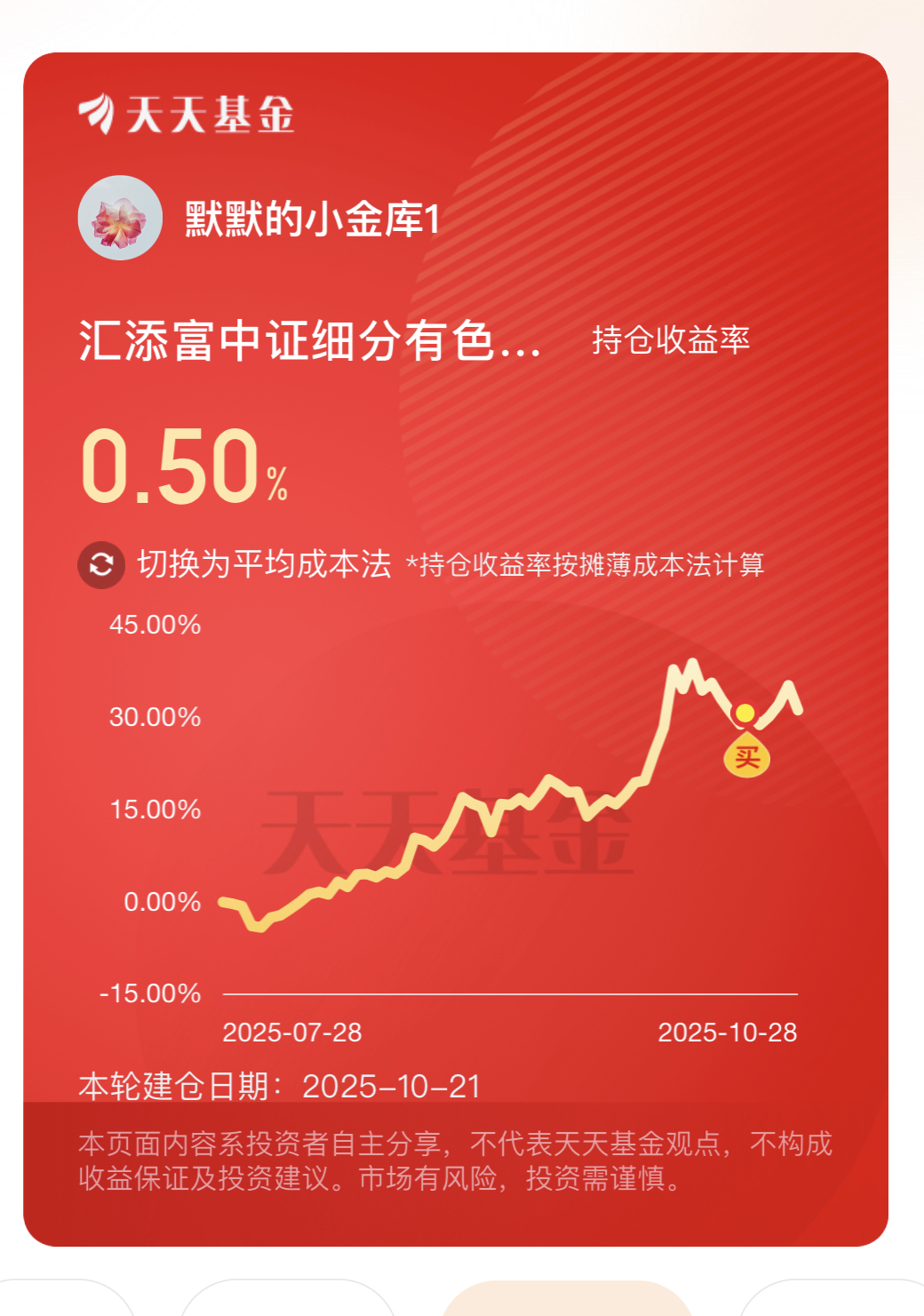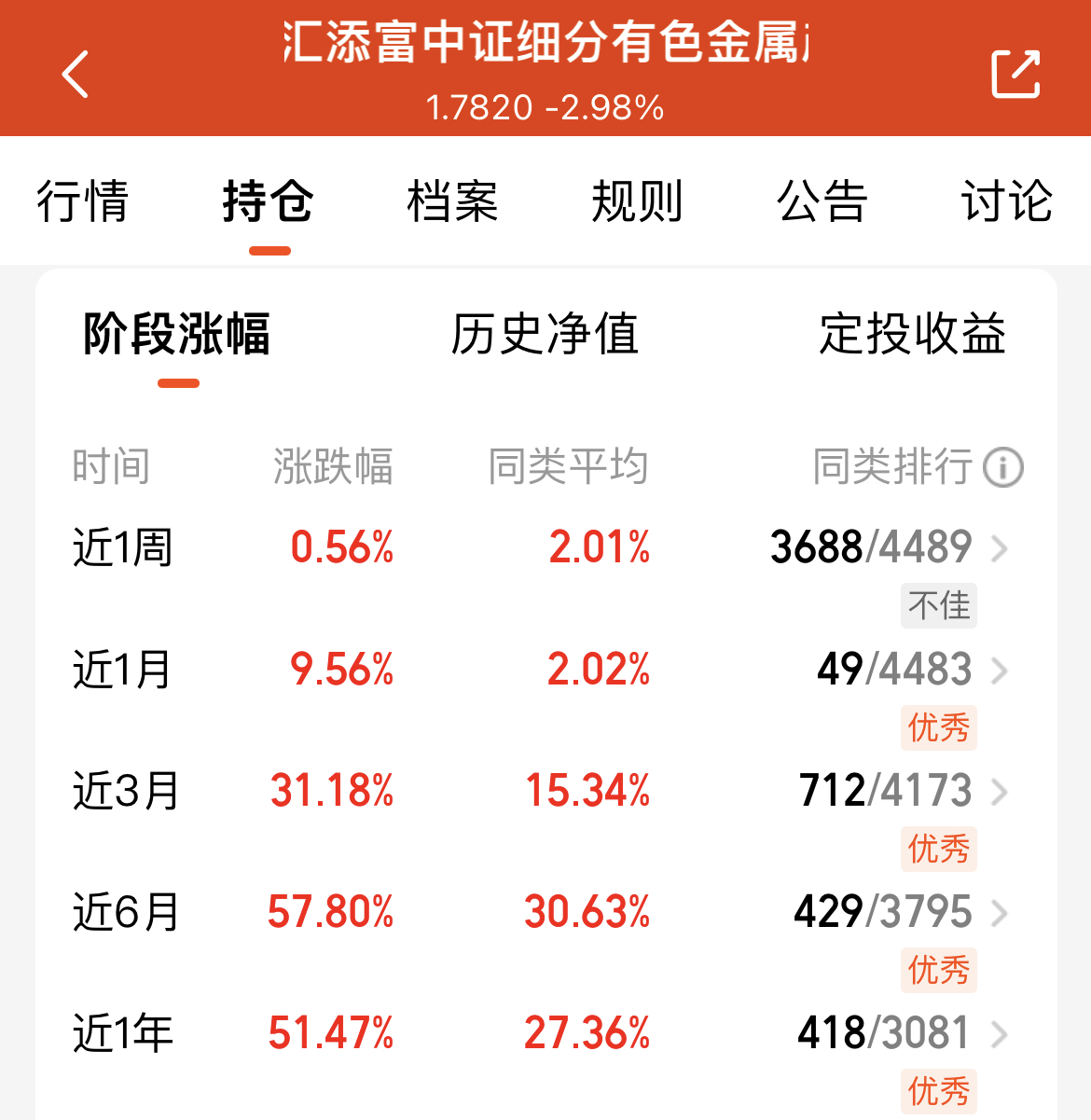 今天大盘行情有所分化,但有色金属板块逆势爆发,我持有的$汇添富中证细分有色金属产业主题ETF发起式联接C(OTCFUND|019165)$今日大涨超3.5%,走势格外强劲。从业绩来看,这只基金表现也很亮眼,近三个月涨31.18%,近半年更是收获57.80%的涨幅,不管是短期追涨还是中长期布局,都能带来可观收益。