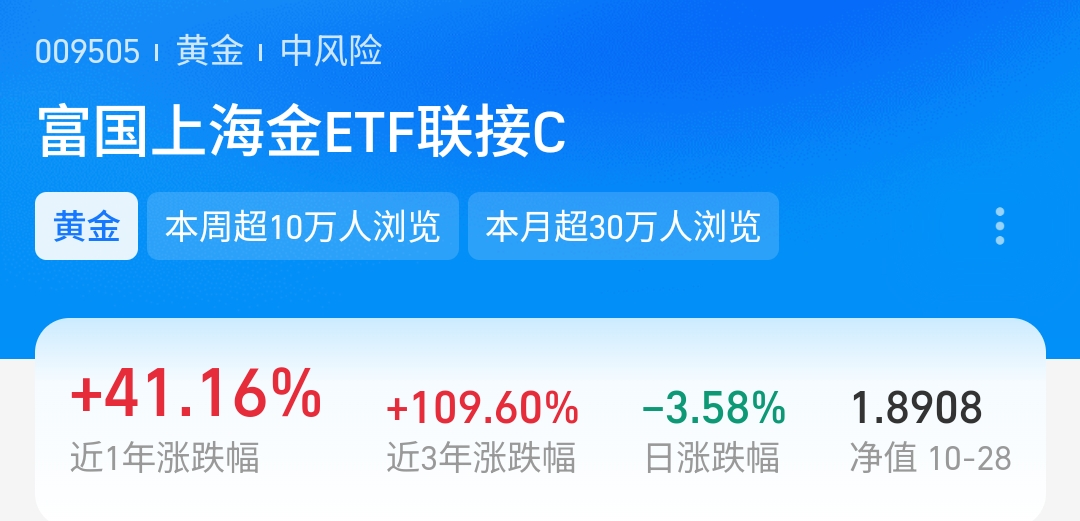$富国上海金ETF联接C$ 上海金就很能打,近一年直接涨了41.16%,长期拿着收益超稳。我觉得现在是布局好时候,今天已经接着加了500进去,跟着黄金长期吃肉。