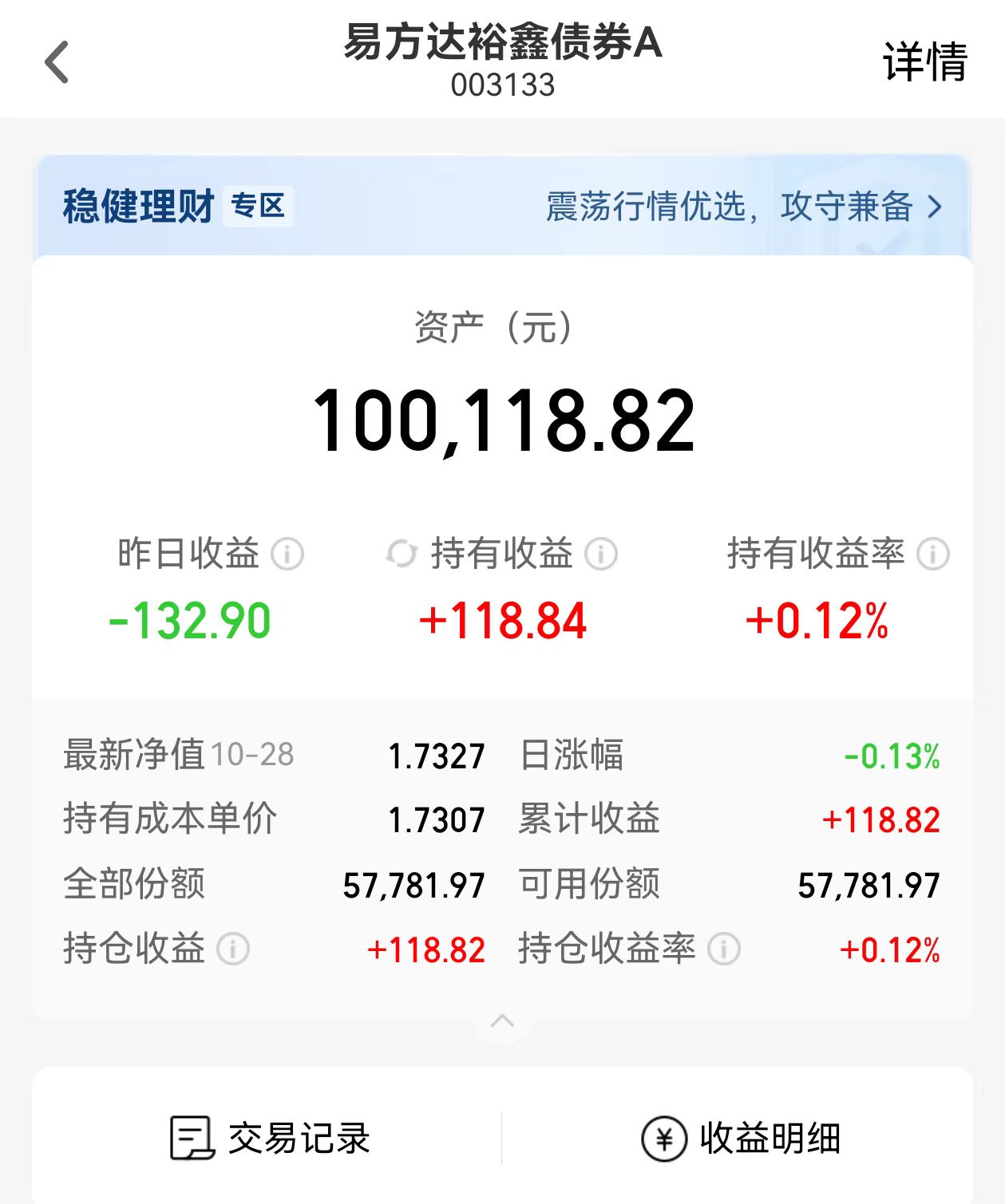 债市天气播报:目前信用债晴,利率债晴。债市方面,昨天在央行重启国债买卖的背景下,纯债大涨,而固收+选手们在权益市场回调的背景下,基本都是碎蛋状态。不过,利好提振出来的涨并不是纯债企稳的代表,同理,固收+的回调也是低吸的机会,固收+性价比优于纯债的阶段还没结束!小小现在不是有10w持仓的$易方达裕鑫债券A(OTCFUND|003133)$吗,近一周收蛋101个,近三月收蛋668个,近六月收蛋1523个,每个时间维度都很强,都甩纯债很多条街,虽然它属于是中波固收+,但是真的就是用很小的风险承受度撬动了很高的收益回撤比,小小主打一个坐稳扶好,当做平衡整体仓位的底座。