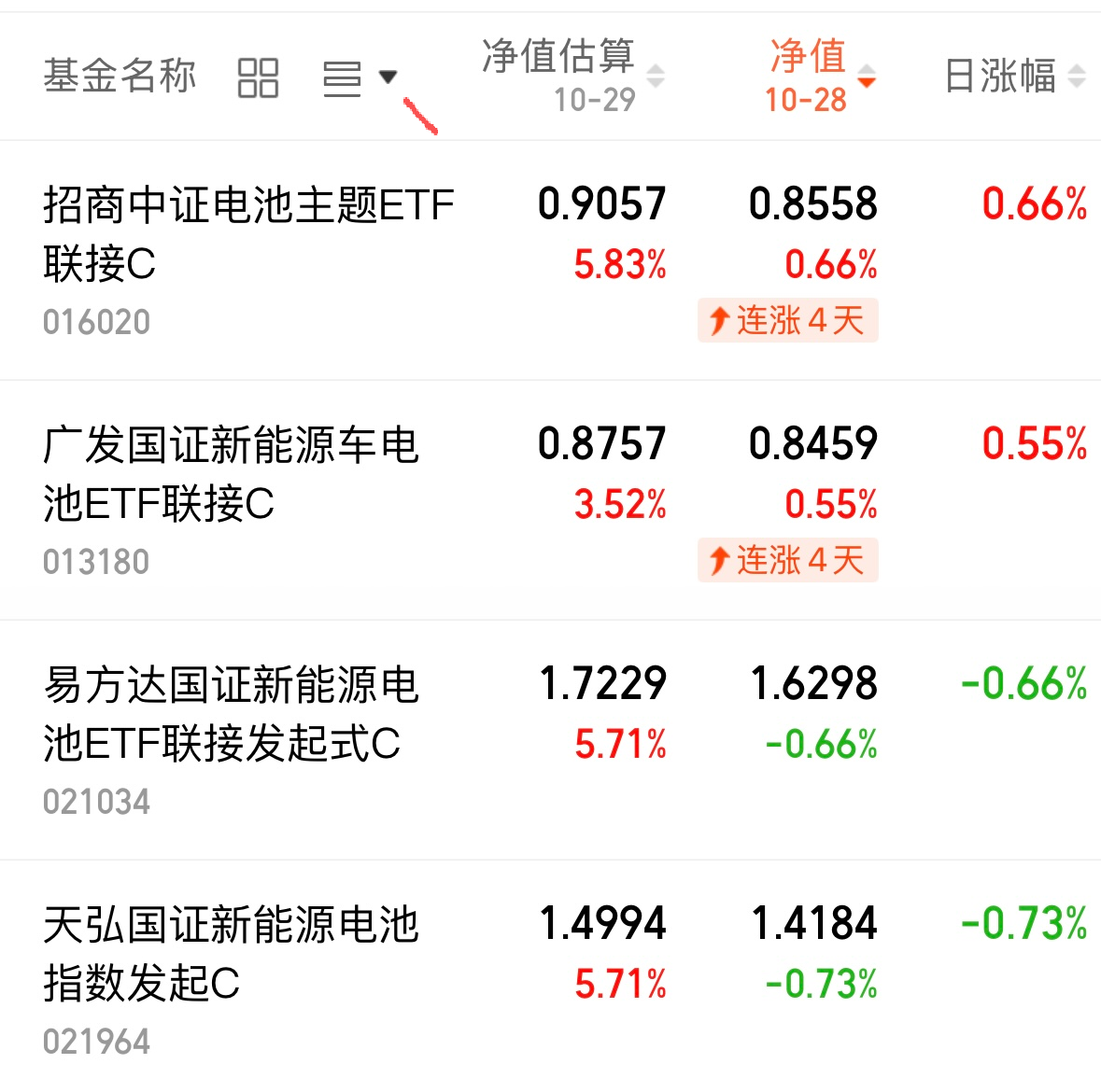 宝子们,电池红的头晕目眩!$招商中证电池主题ETF联接C(OTCFUND|016020)$昨天涨0.66%,连涨4天,今天估值+5.83%,又是红麻了!这下就连续上涨5天了!