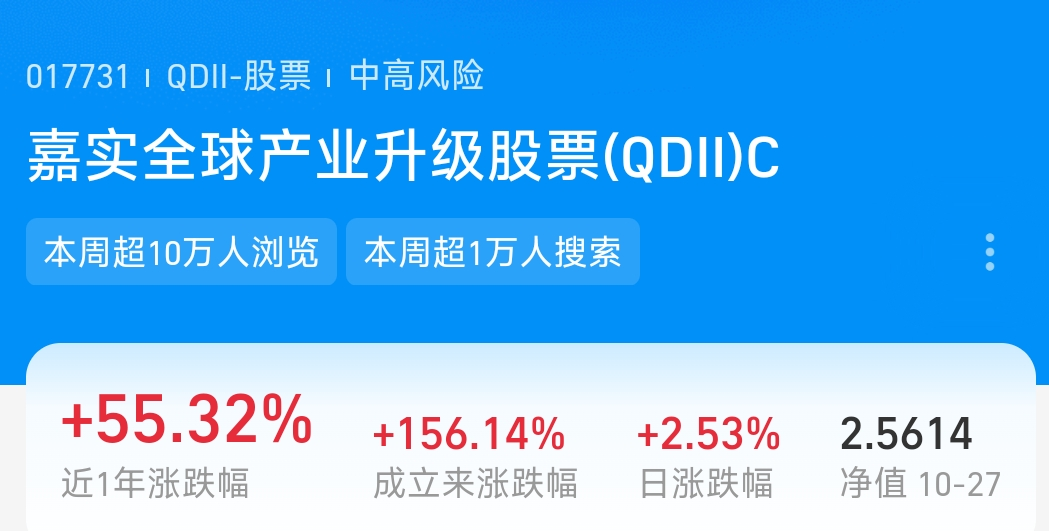 美股这边强的可怕啊,夜盘英伟达的股价继续新高,逼近5万亿的市指,CEO还表示预计2026年底芯片订单继续扩展,这消息刺激啊$嘉实全球产业升级股票发起式(QDII)C$ $ 这个占比了一些美股还有a股的目前预估涨1.26%左右啊,期待后续继续上涨!