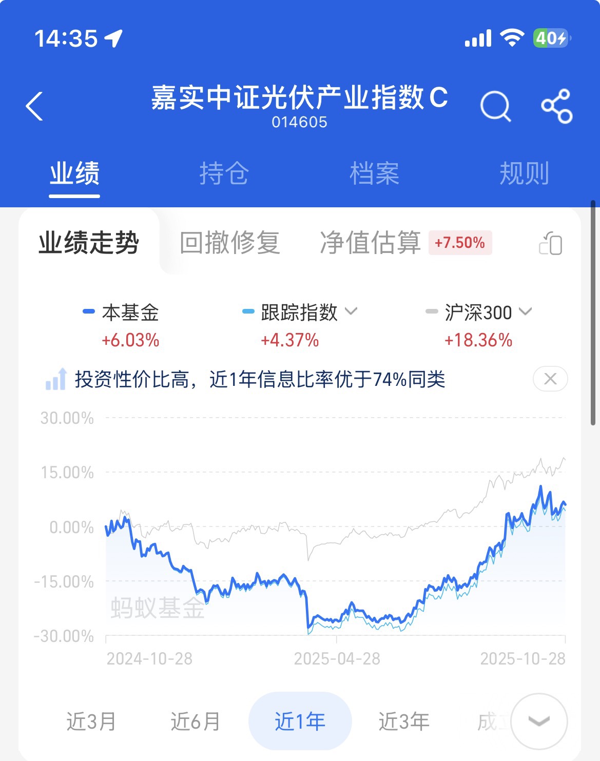 下午好呀,今天下午行情拉升,沪指突破4000点,光伏板块领涨呀,这支$嘉实中证光伏产业指数C$ 已经涨了7.5%了,业绩方面这只基金近3月涨了25.09%,近半年更是飙到42.76%,短期长期势头都很亮眼。而且它持仓太会选了,前十大重仓股全是光伏产业链龙头。现在光伏“反内卷”已经是国家战略级方向了,高层多次开会整治低价竞争,还推动落后产能退出,行业拐点眼看就要来。加上“碳中和”是长期国策,十五五规划里绿色经济也是重点,光伏作为核心赛道,未来空间超大。我个人继续看好这支。