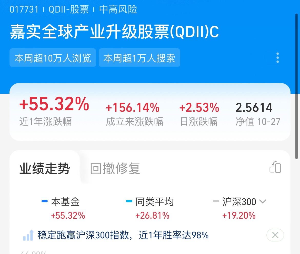 最近股市整体走势还算平稳,也让科技板块的长期价值更受关注了。像$嘉实全球产业升级股票发起式(QDII)C$ 这段时间的表现就挺让人安心,近一年能有55.32%的收益,昨晚单日还涨了2.53%,在同类型基金里排在前面。它主要投的是全球科技核心领域,还兼顾了AI、半导体这些有潜力的方向,配置思路比较扎实,后续要是能保持这样的节奏就挺好。