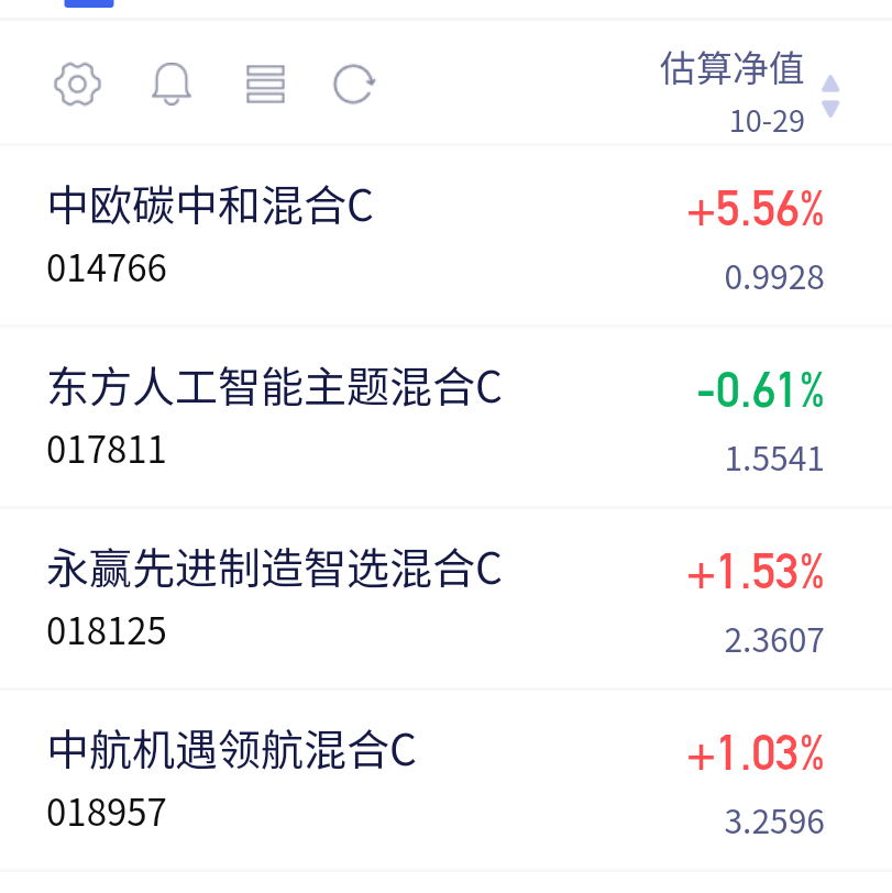 大盘今天涨了不少,大科技、新能源能板块今天大涨,今天可以继续吃肉了,来看看目前估值!$中欧碳中和混合发起C(OTCFUND|014766)$目前预估涨幅5.56%