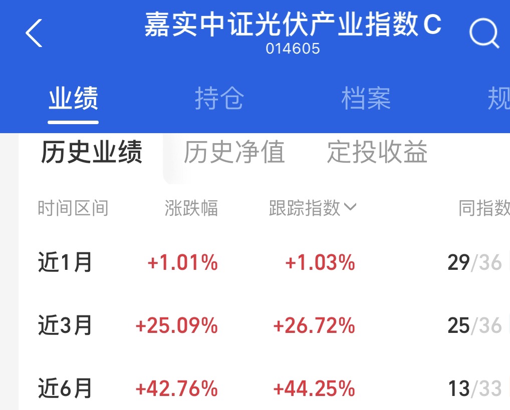 今天股市强势拉升,三大指数集体上涨。板块上,光伏指数午后涨幅超2个点,行业的景气度预期回升。我关注的$嘉实中证光伏产业指数发起式C$ 持股相对集中,重仓股阳光电源、TCL科技、隆基绿能等等在光伏和电网产业全面覆盖,投资策略清晰。昨天小幅回调,今天就立马拉升了,从历史净值可以看出它连涨行情较多,近一周上涨0.99%,近半年上涨42.76%,密切跟踪 光伏产业指数,风险控制能力较强。对呀这次的反弹我觉得是新一轮的行情打开了,期待后面的连涨表现