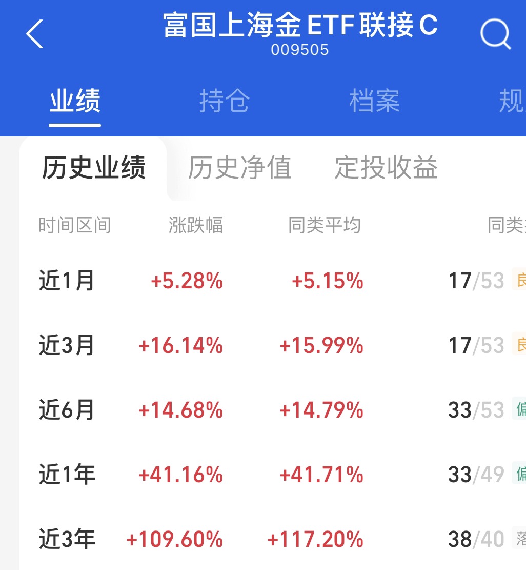 从这次的黄金回调来看,我发现上海金的回撤能力较强。年内预计还有两次降息,在降息周期中,对黄金的影响也是较大的。关注的$富国上海金ETF联接C$ ,收益稳健,波动较低。可以精准捕捉到国内金价的上涨机会,而且没有汇率损耗问题,可以有效避免跨境黄金的风险波动。该基金近一月上涨5.28%,近一年上涨41.16%,长期来看收益还不错。经理人王乐乐投资经验丰富,加上黄金租赁机制,可以增加收益空间,我觉得在降息驱动下,金价有上行空间,而且风险程度也较低,今天提前埋伏了