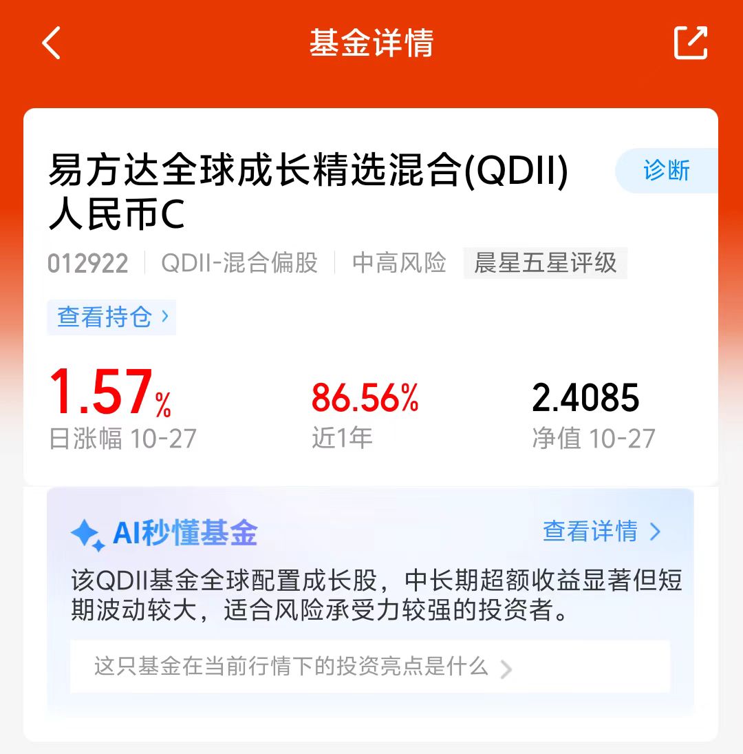 大盘今天涨起来了,上证指数突破4000点,科技板块表现不错,美股昨晚也涨了不少呢,易方达全球成长精选混合C持仓可投全球科技板块,美股、港股和A股都能投,近六个月涨了83.25%,回撤也控制的不错,看好这个方向,哪个市场涨起来都能跟上,我准备分批加仓!