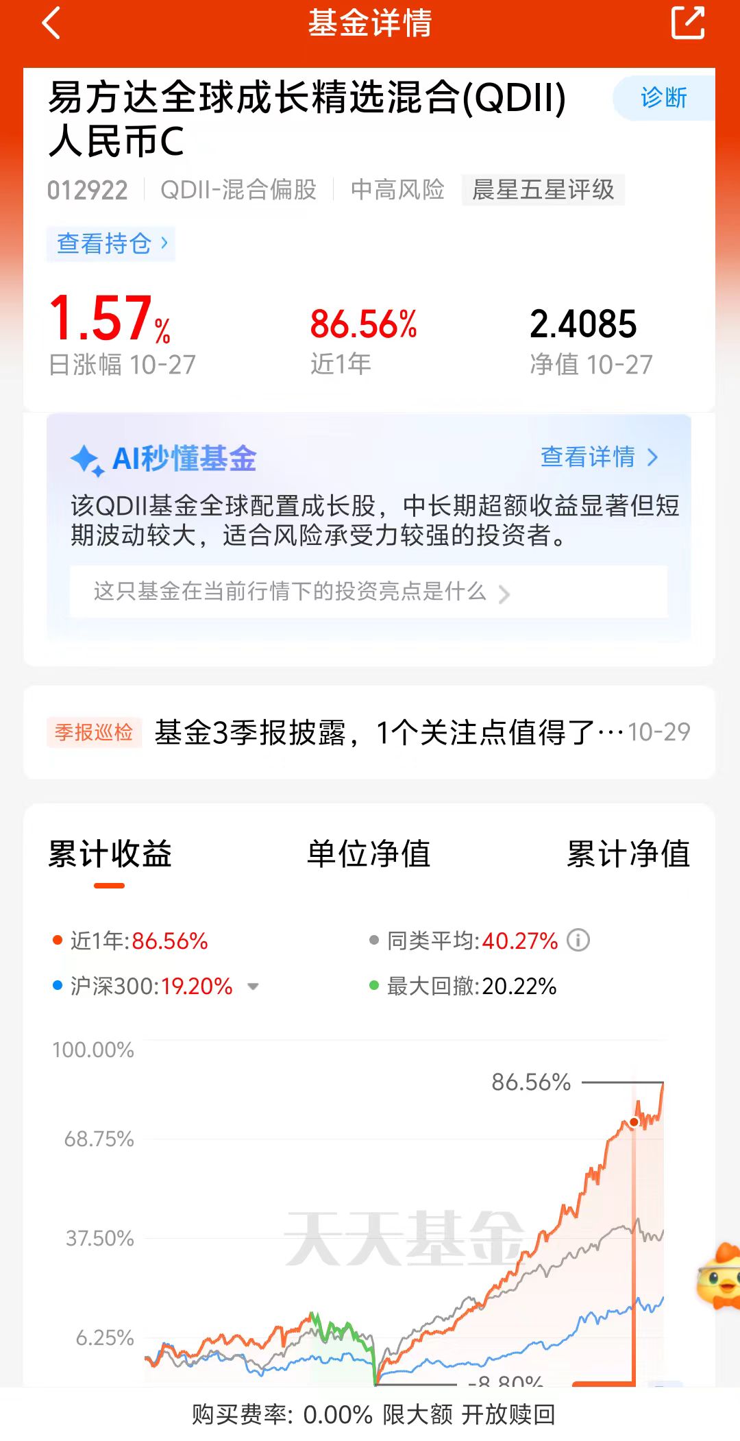 大盘今天涨起来了,科技板块表现不错,上证指数突破4000点,太强了,近期全球科技板块表现不错,美股昨晚也涨了不少呢,易方达全球成长精选混合C持仓可投全球科技板块,灵活把握美股、A股和港股科技成长机遇,近一年涨了86.56%,还是历史绩优低回撤榜一,回撤控制的也不错,经理能力可以,我准备分批加仓!