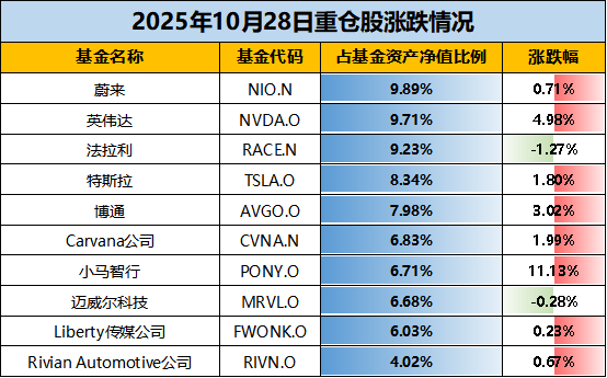 【十大持仓】根据最新披露的基金定期报告,截至2025年三季度末,华宝海外新能源汽车前十大重仓股包括蔚来、英伟达、法拉利、博通、特斯拉、Carvana公司、小马智行、迈威尔科技、Liberty传媒公司、Rivian Automotive公司,占基金资产净值比例合计为75.42%。