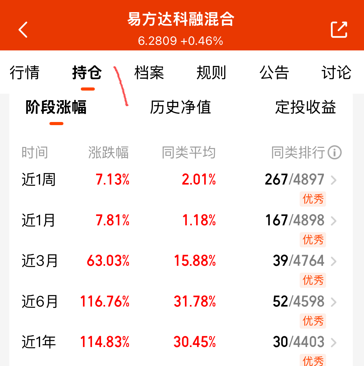 上午小涨,下午大涨,红麻了!恐高肯定的,毕竟4000也是十年新高了,我看很多友友追细分赛道去了,这个时候我倾向于混合基,主打一个雨露均沾,易方达科融混合,近一周7%,近六月116%,不仅买了科技,还买了反内卷相关的新能源相关的,业绩来看,经理的水平是非常在线的了。牛市不会轻言结束,继续看好!