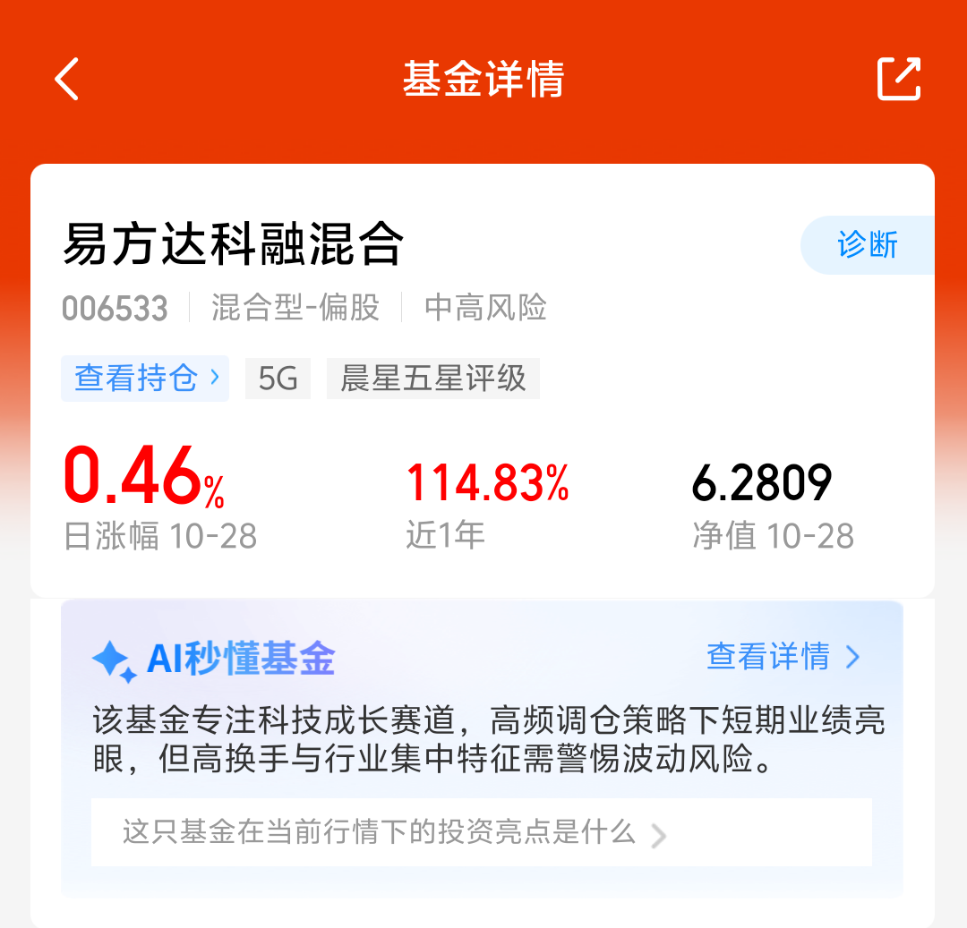 大盘今天涨起来了,盘中三大指数持续拉升,科技板块今天表现不错,新能源也涨了不少,近期各大板块轮动速度比较快,我准备分散持仓,易方达科融混合持仓有科技、新能源、军工等板块,不惧轮动,可以有效的分散风险,近一年涨了114.83%,相信经理的全市场配置,我准备分批上车了!