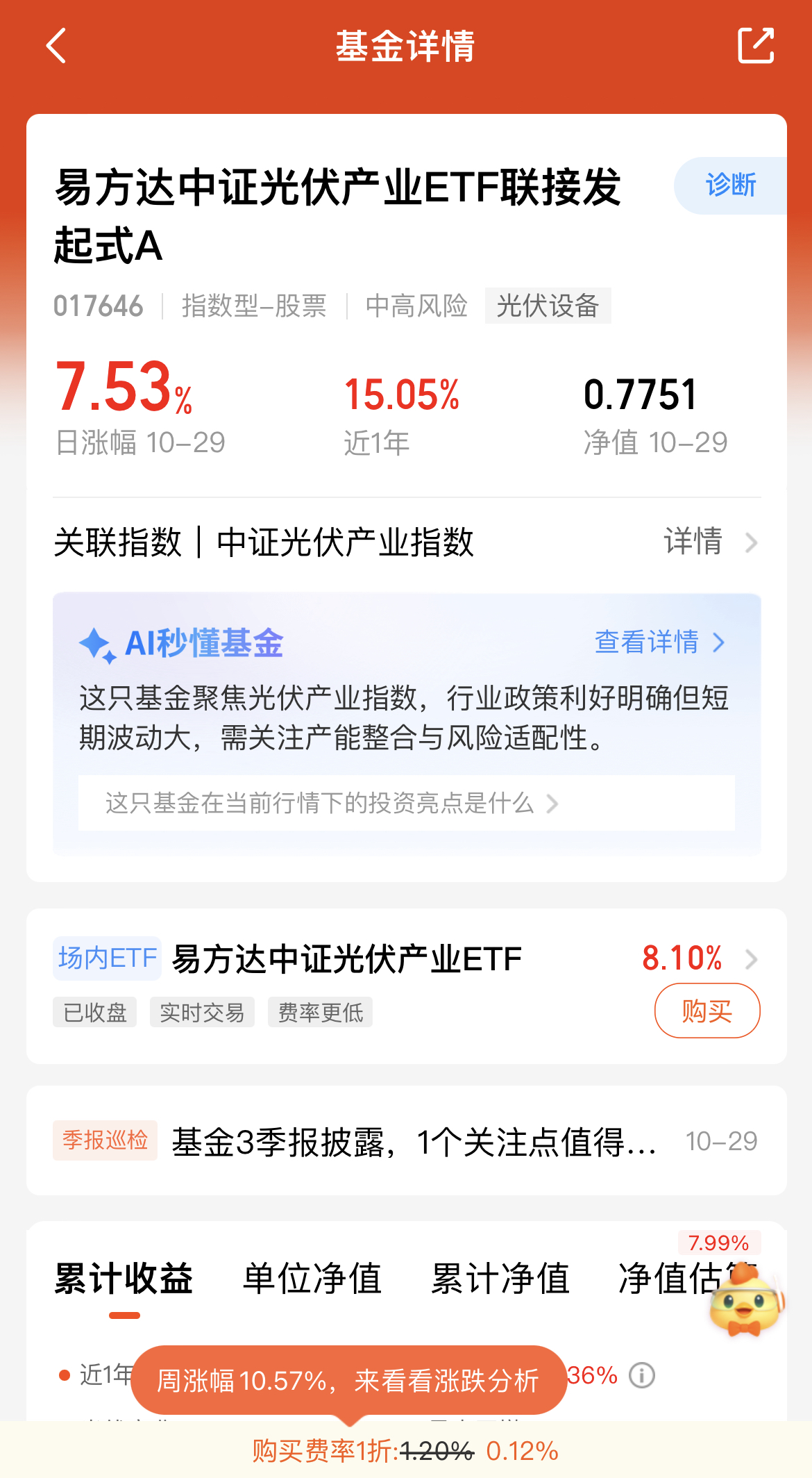 $易方达中证光伏产业ETF联接发起式A(OTCFUND|017646)$也跟着大涨7.53%,算下来近三个月涨了32.41%,近半年更是有52.55%的涨幅,表现特别亮眼。这波行情背后利好不少,多晶硅收储有了新进展,加上龙头企业三季报亮眼,行业景气度在慢慢回升。这只基金能紧跟光伏指数,覆盖全产业链,我很看好光伏的长期机会,今天分批布局起来。